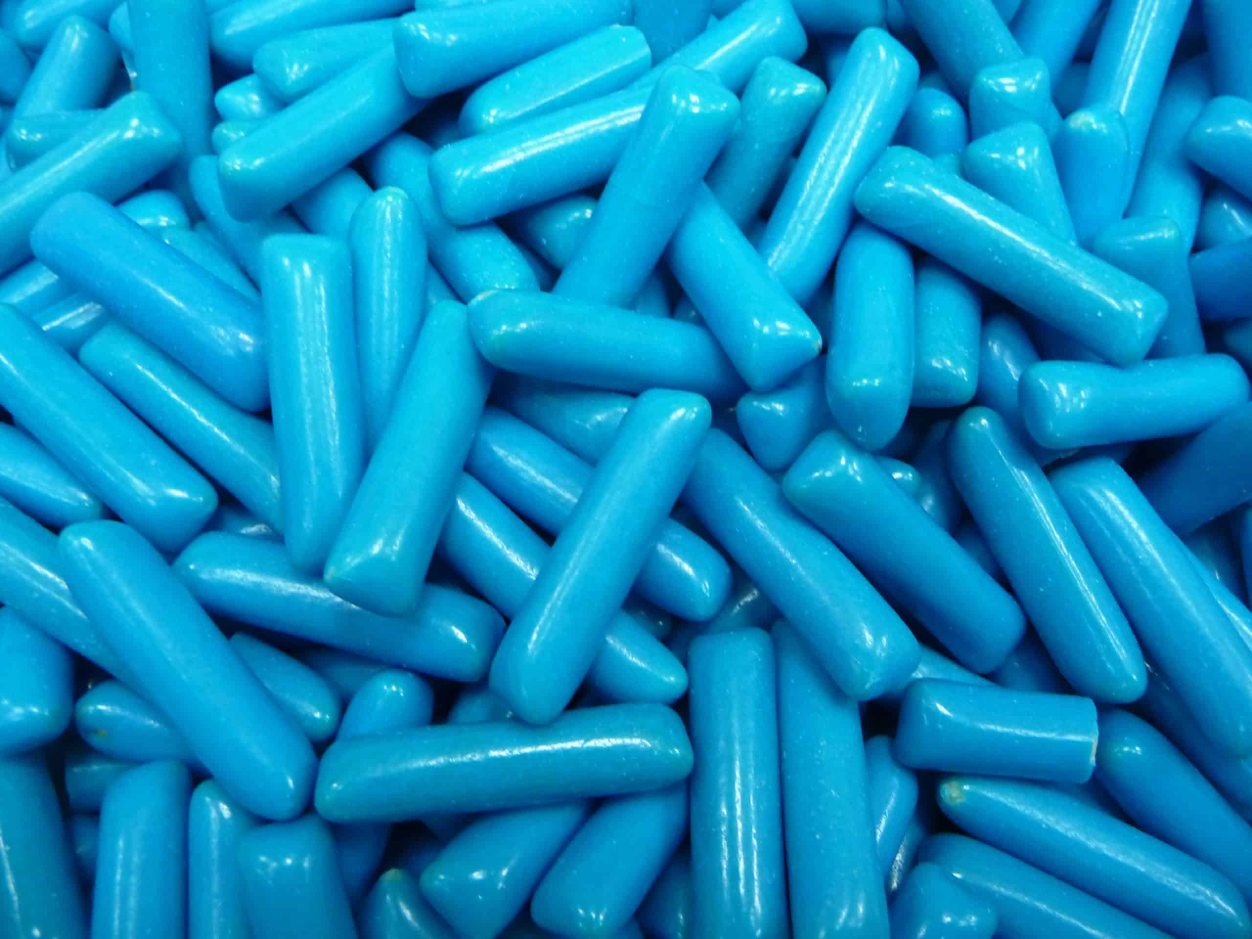 Bonbons tendres dragéifiés goût framboise. Ingrédients : sucre , sirop de glucose , graisse de palme , 5 % jus de fruits à base de concentrés ( pomme , pêche , citron , fraise , framboise ) , gélatine * , stabilisant : gomme arabique ; amidon modifié , dextrose , acidifiants : acide lactique , acide citrique ; arôme naturel , émulsifiant : lécithines ; colorant bleu brillant FCF; concentrés de fruits et de plantes : spiruline , pomme , carotte , radis , cassis ; agents d’enrobage : cire de carnauba , shellac , cire d’abeille blanche et jaune . * gélatine bovine .