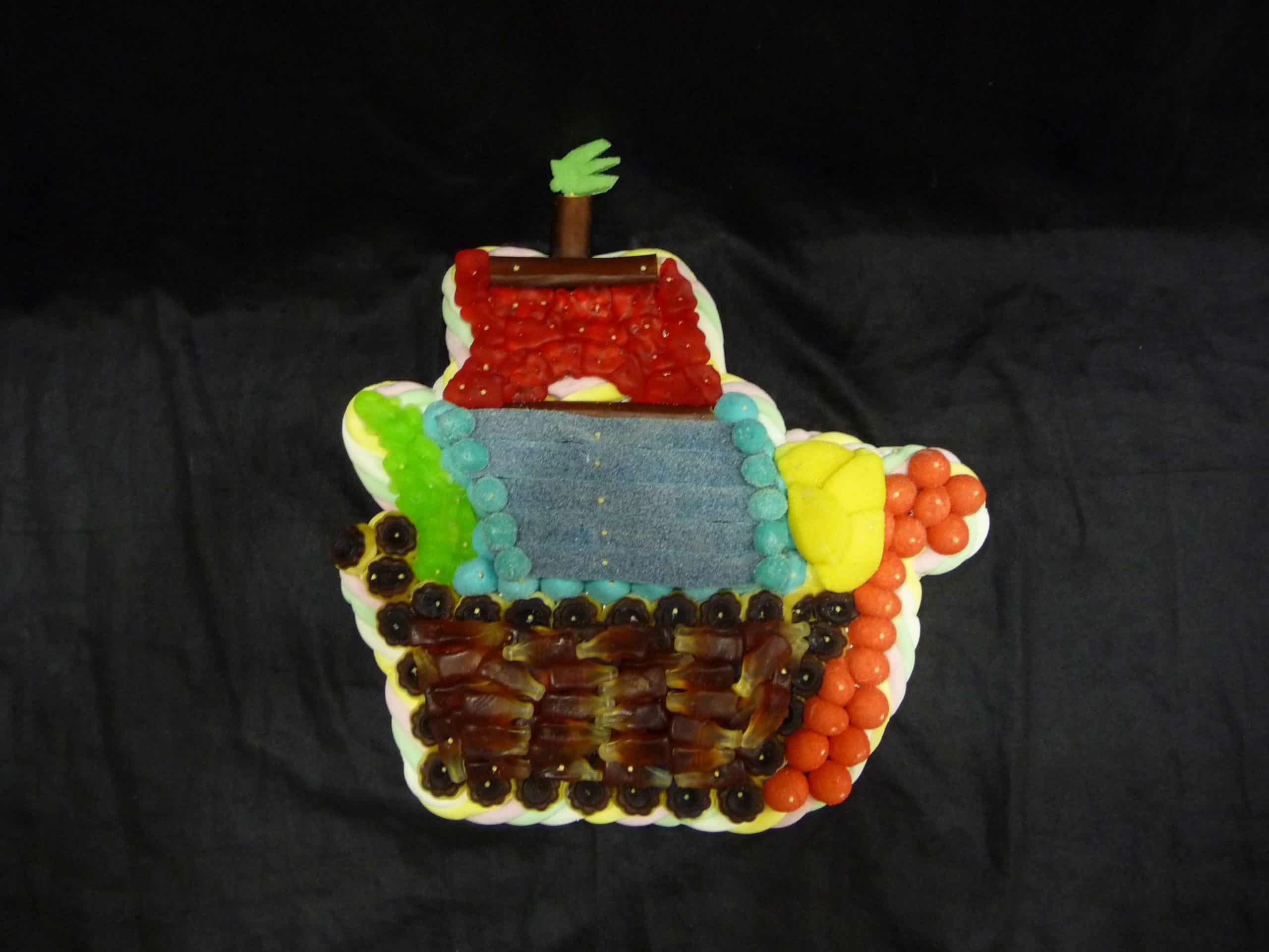 Gâteau de bonbons en forme de bateau de pirate contenant au moins 1kg200 de bonbons. Contour en marshmallow avec à l’intérieur des minis confiseries de 10 variétés différentes.
