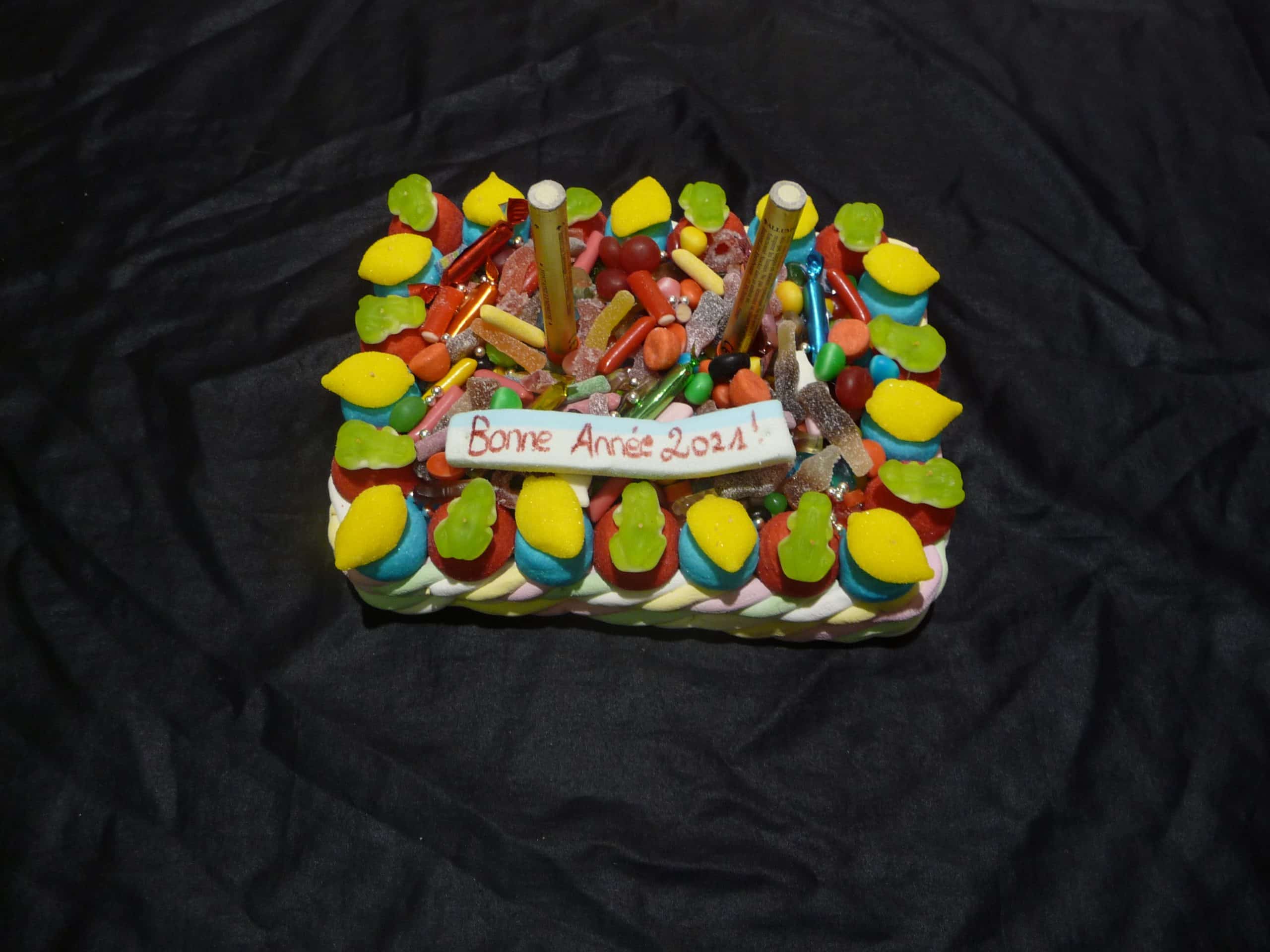 Gâteau de bonbons ” Bonne Année ” avec ses deux fontaines de fête. Le contour est en marshmallow. Intérieur garni d’un mélange de petites confiseries.