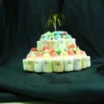 Gâteau de bonbons en forme de camion de pompier. Le contour est en marshmallow. Intérieur garni d’un mélange de petites confiseries.