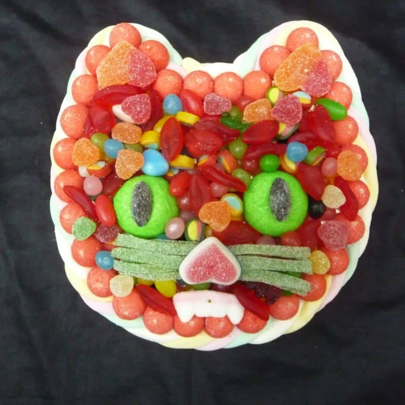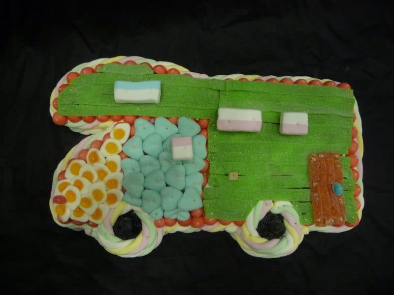 Gâteau de bonbons en forme de Camping Car, contenant au moins 1kg500 de bonbons. Contour en marshmallow avec à l’intérieur des minis confiseries de 10 variétés différentes.