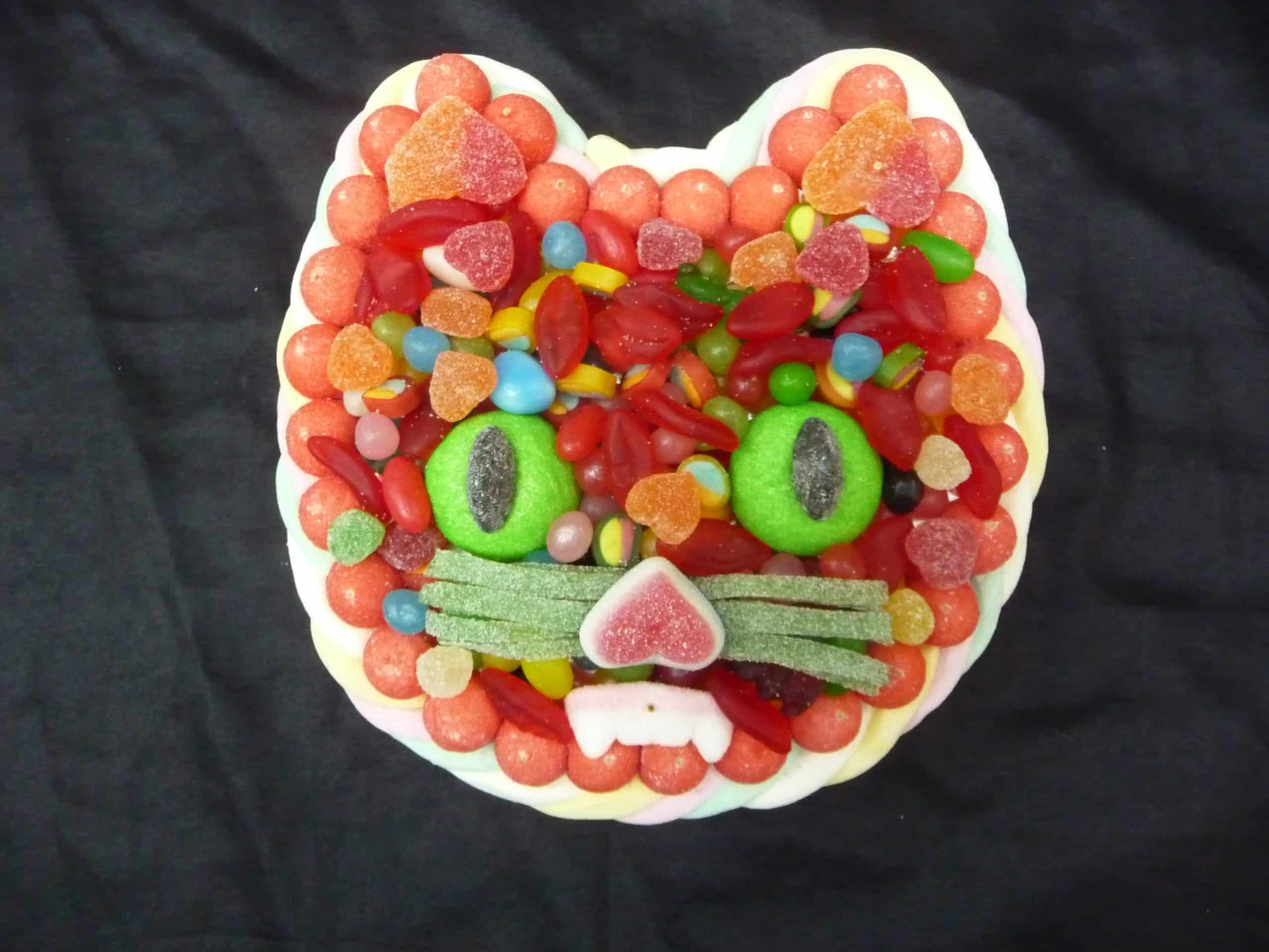 Gâteau de bonbons en forme de chat, avec au minimum 600 g de bonbons. Contour en marshmallow avec à l’intérieur des minis confiseries de 10 variétés différentes. Moustaches en fils cola Hitschler.