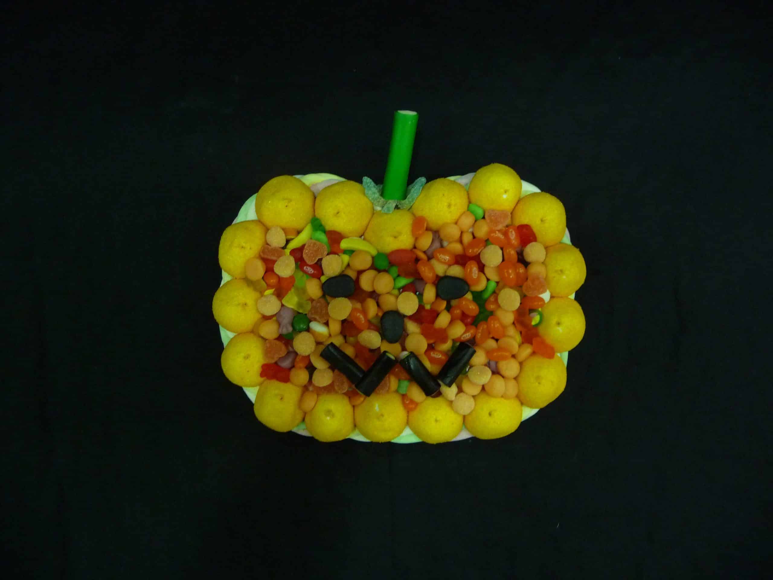 Gâteau de bonbons en forme de citrouille. Le contour comporte une base de marshmallow pour donner du volume et bloquer la petite confiserie. Intérieur comprenant un mélange d’une dizaine de variétés de petites confiseries.