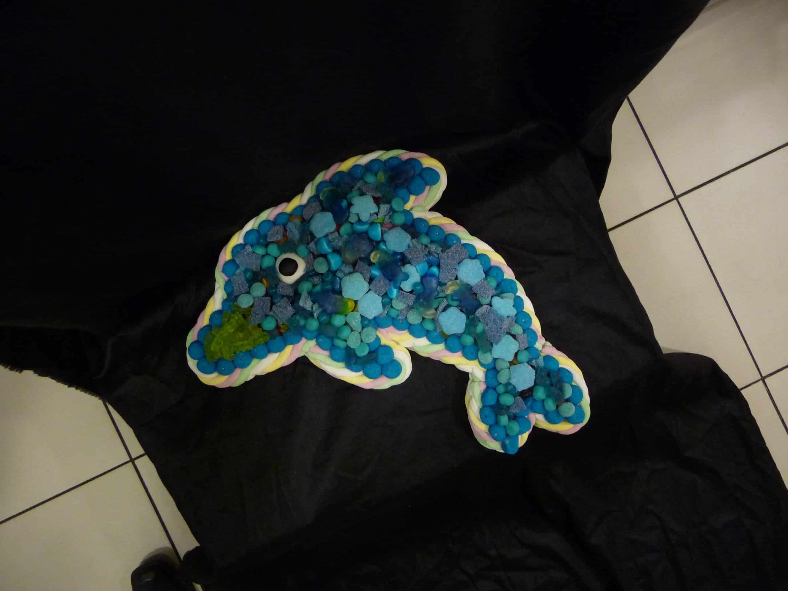 Gâteau de bonbons en forme de dauphin, contenant au minimum 1,500 kg de bonbons. Contour en marshmallow avec à l’intérieur des minis confiseries de 10 variétés différentes.