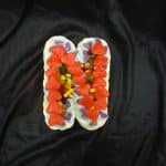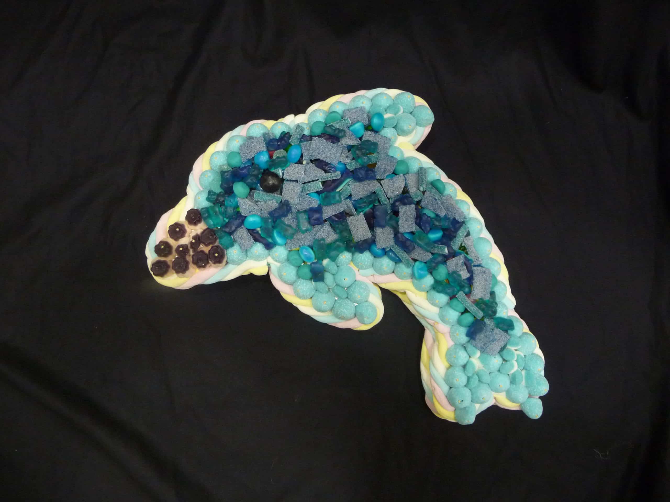 Gâteau de bonbons en forme de dauphin, contenant au moins 1,200kg de bonbons. Contour en marshmallow avec à l’intérieur des minis confiseries de 10 variétés différentes.