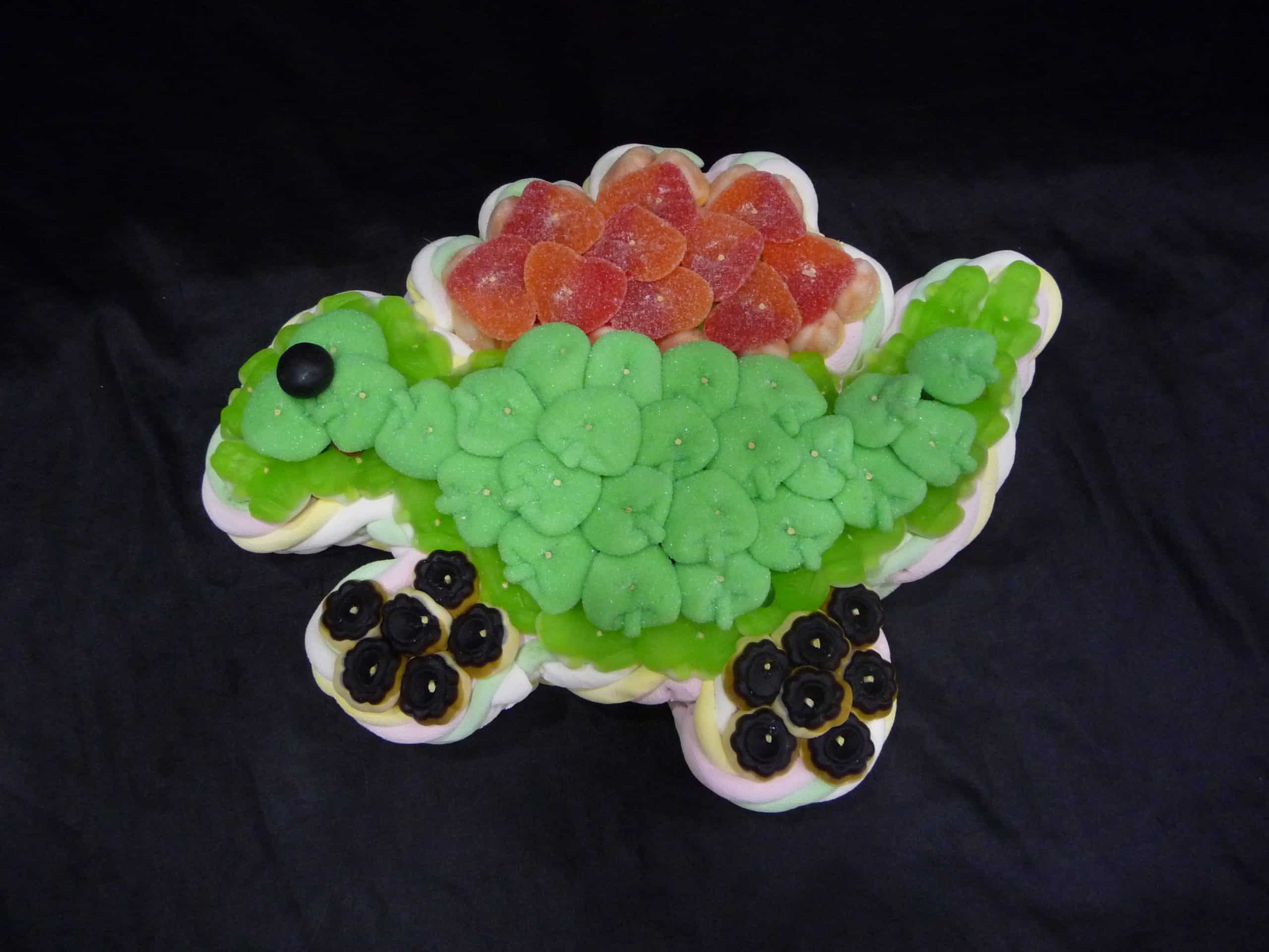 Gâteau de bonbons en forme de dinosaure, contenant au moins 900 g de bonbons. Contour en marshmallow avec à l’intérieur des minis confiseries de 10 variétés différentes.