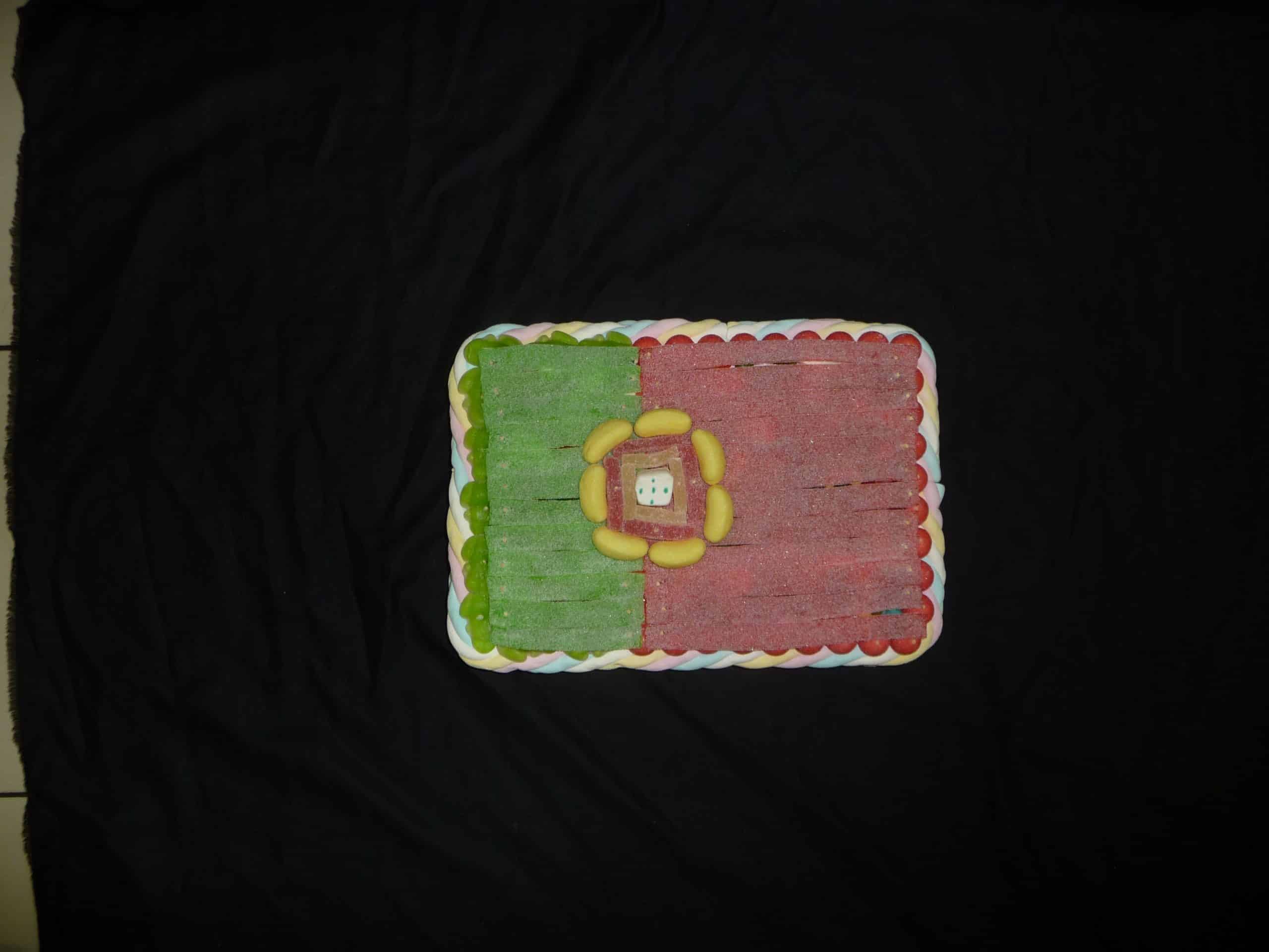 Gâteau de bonbons en forme de drapeau du Portugal, contenant au moins 1kg500 de bonbons. Contour en marshmallow avec à l’intérieur des minis confiseries de 10 variétés différentes.