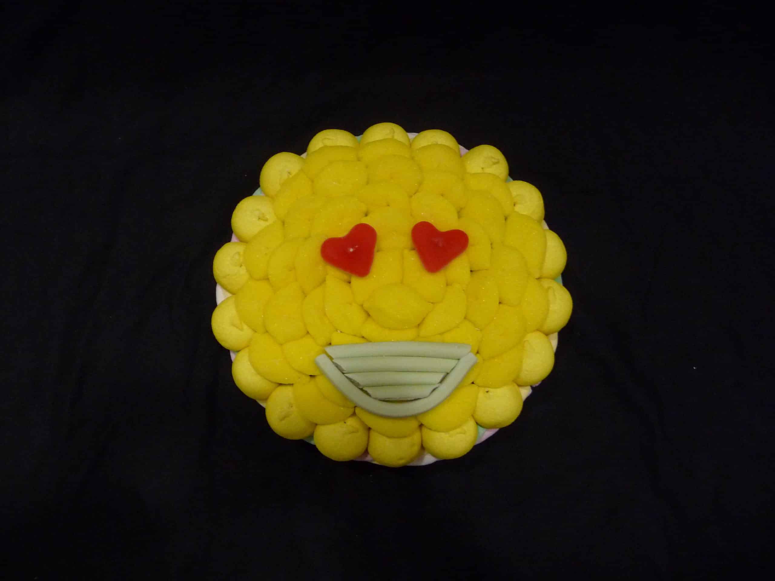Gâteau de bonbons en forme de Smiley. Contour en marshmallow. Intérieur garni de petites confiseries.
