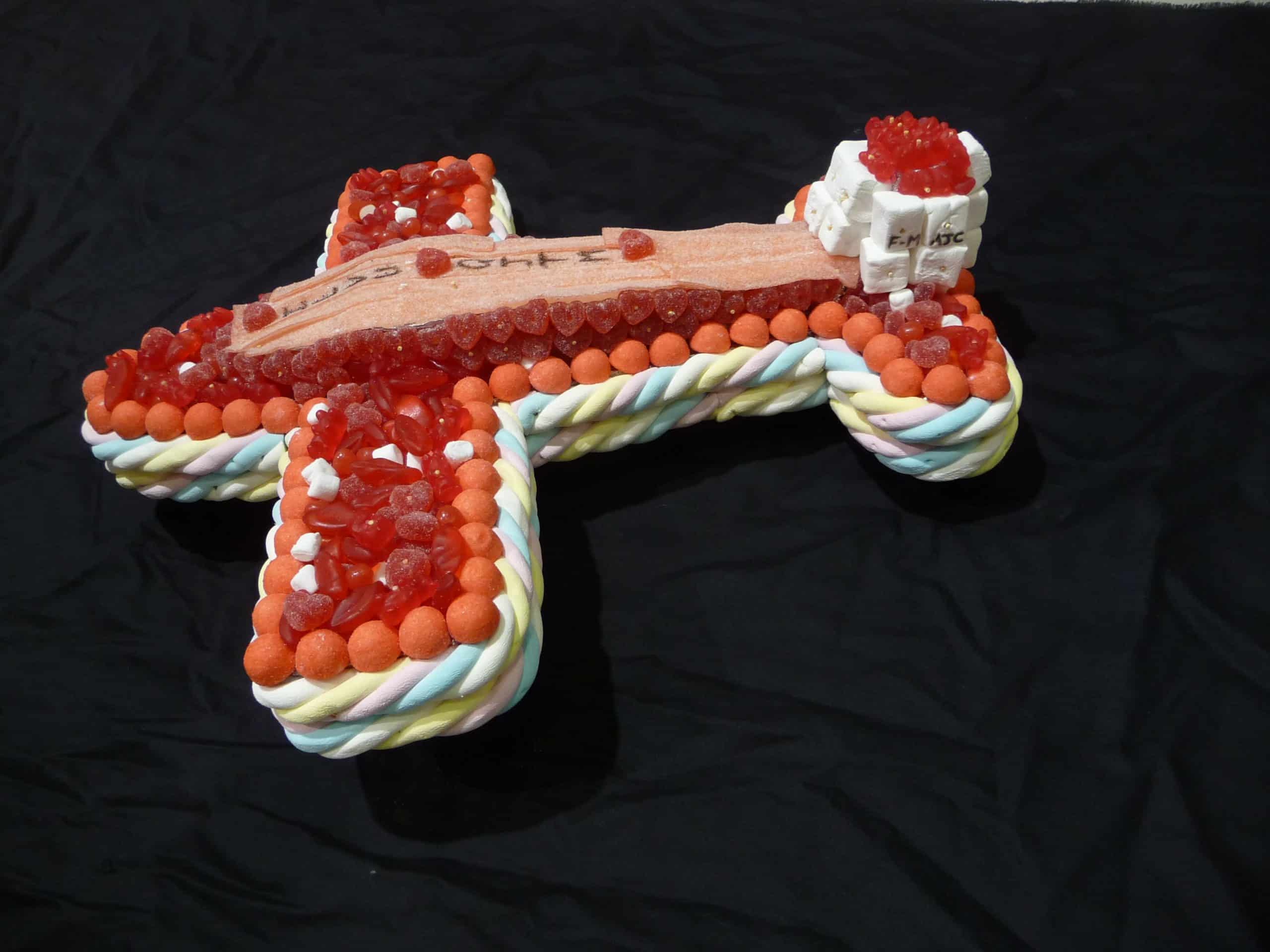 Gâteau de bonbons en forme d’avion, contenant au minimum 1kg800 de bonbons. Contour en marshmallow avec à l’intérieur des minis confiseries de 10 variétés différentes.