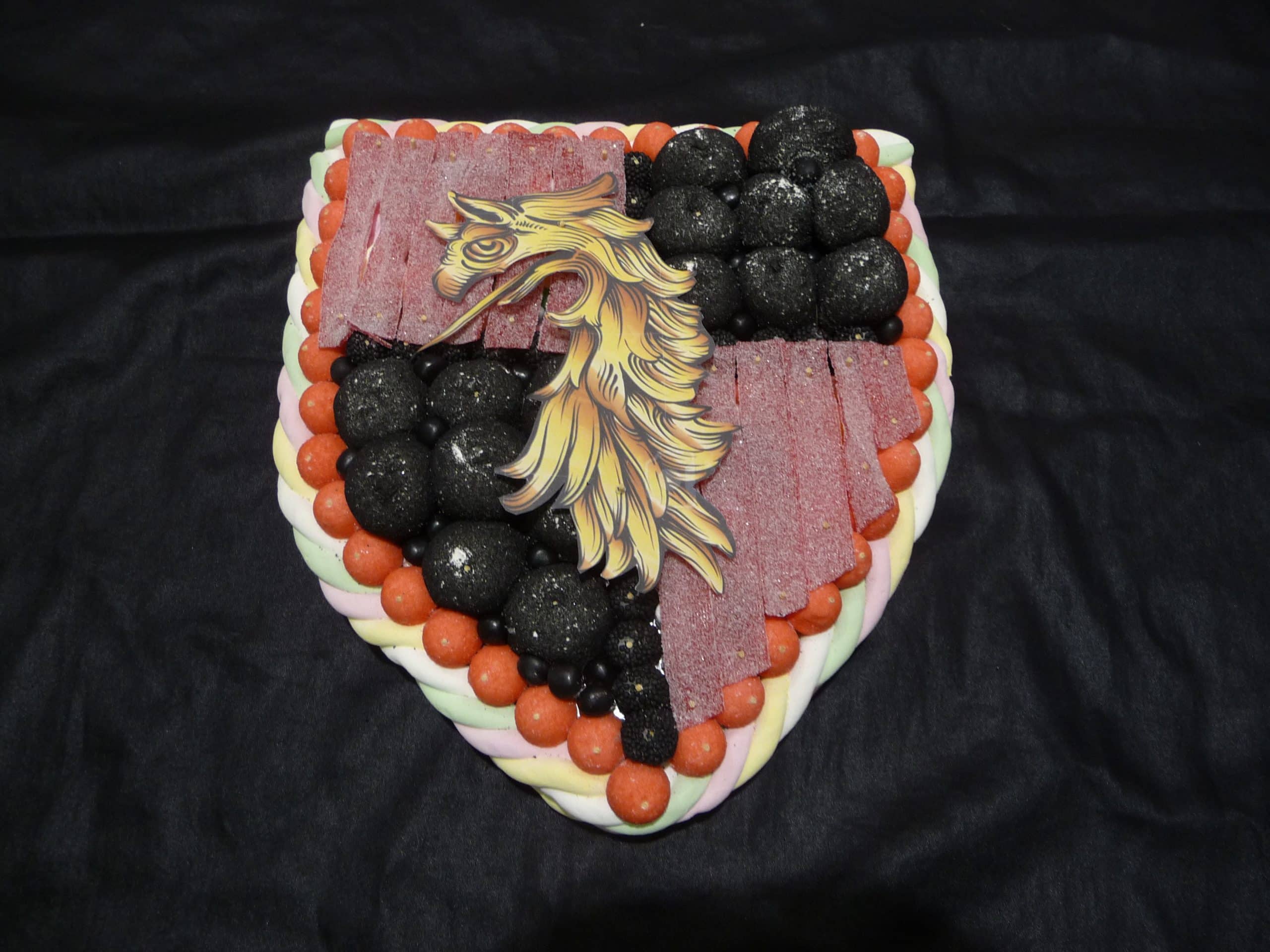 Gâteau de bonbons en forme du bouclier d’Harry Potter. Contour en marshmallow. Intérieur garni de petites confiseries.