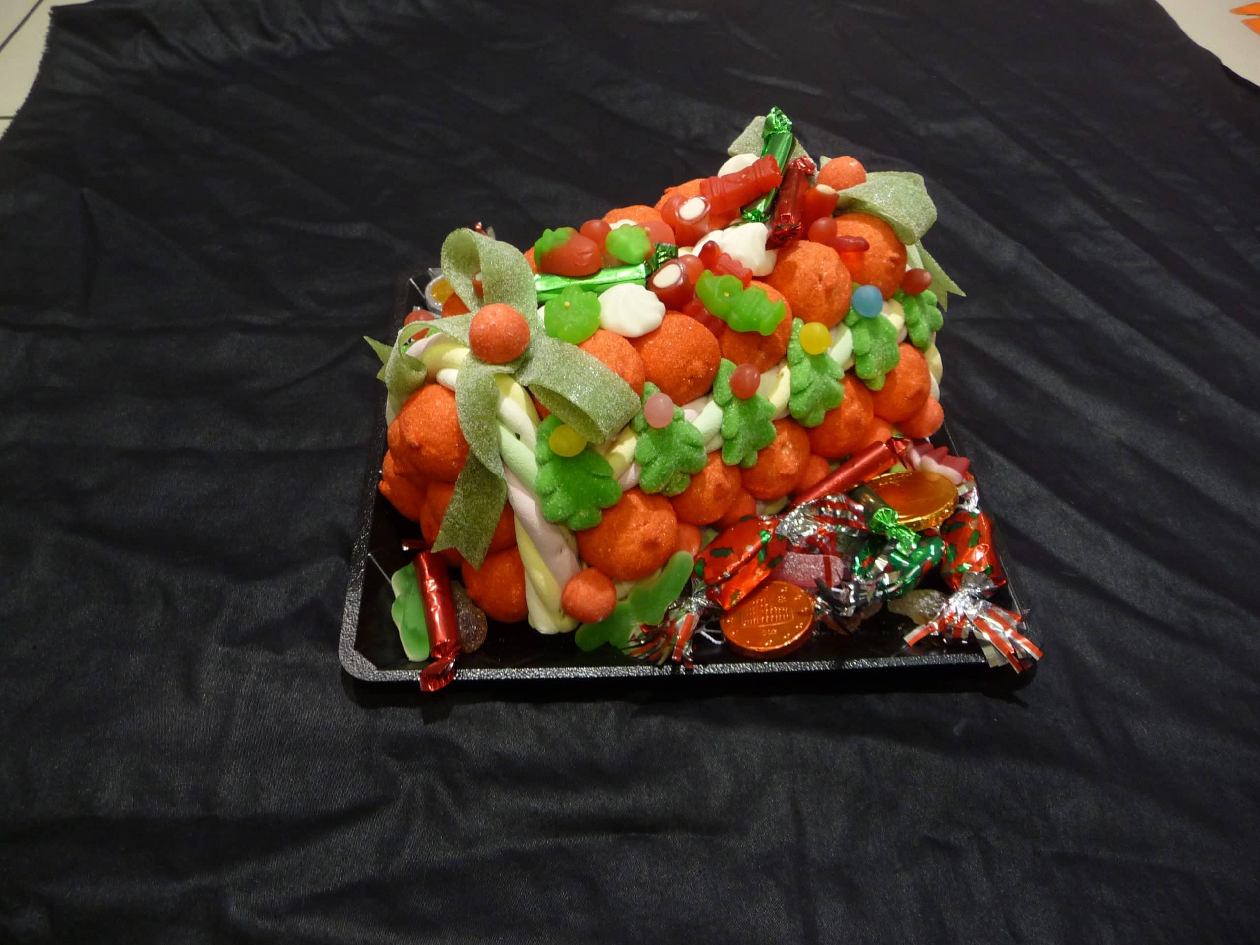 Gâteau de bonbons en forme de Bûche de Noël, contenant au minimum 1,2 kg de bonbons. Contour en marshmallow avec à l’intérieur un mélange de petites confiseries de 10 variétés différentes.