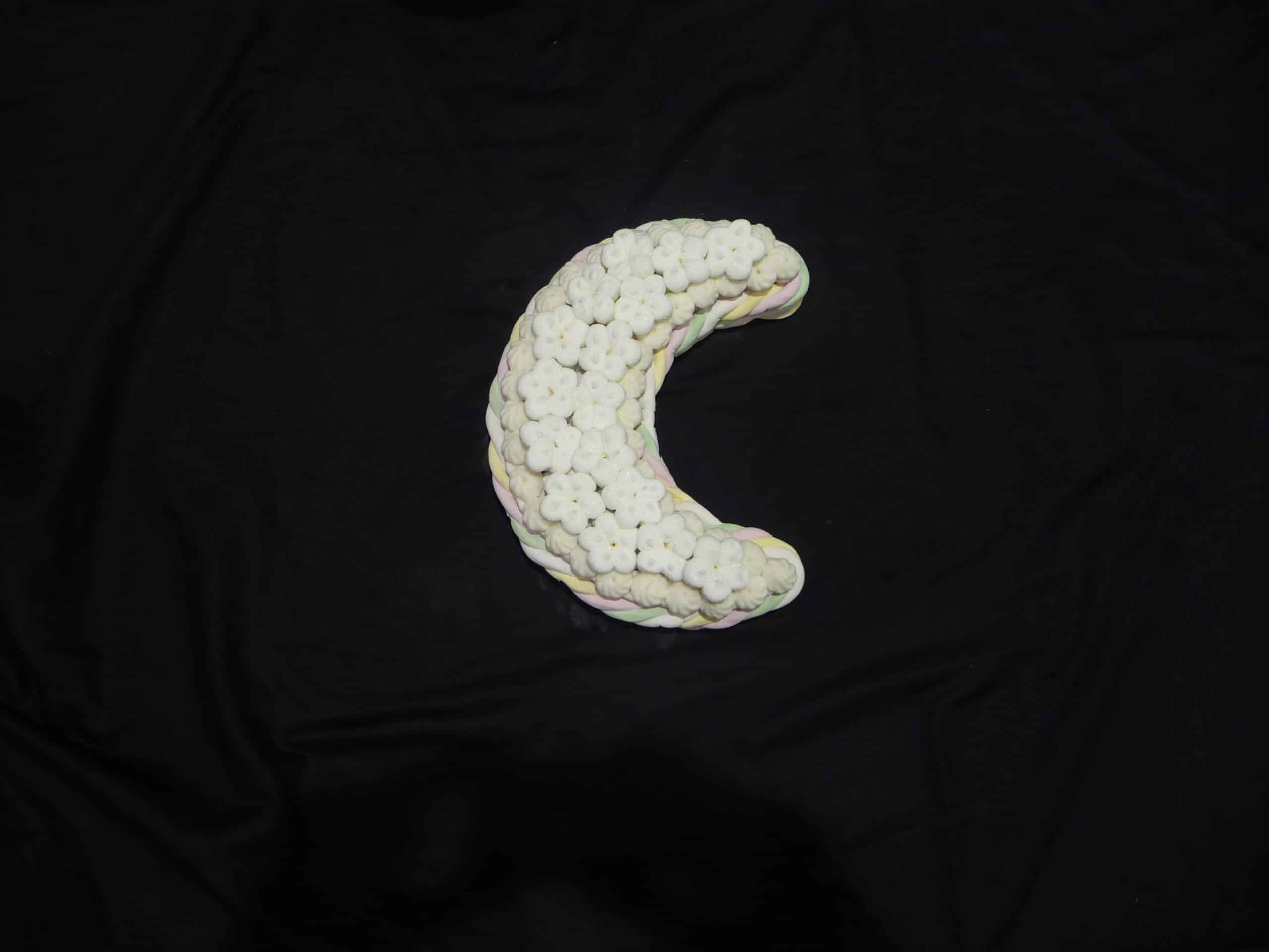 Gâteau de bonbons en forme de croissant de lune, comportant 0.900 kg minimum de confiseries. Contour en marshmallow et intérieur garni de petites confiseries.