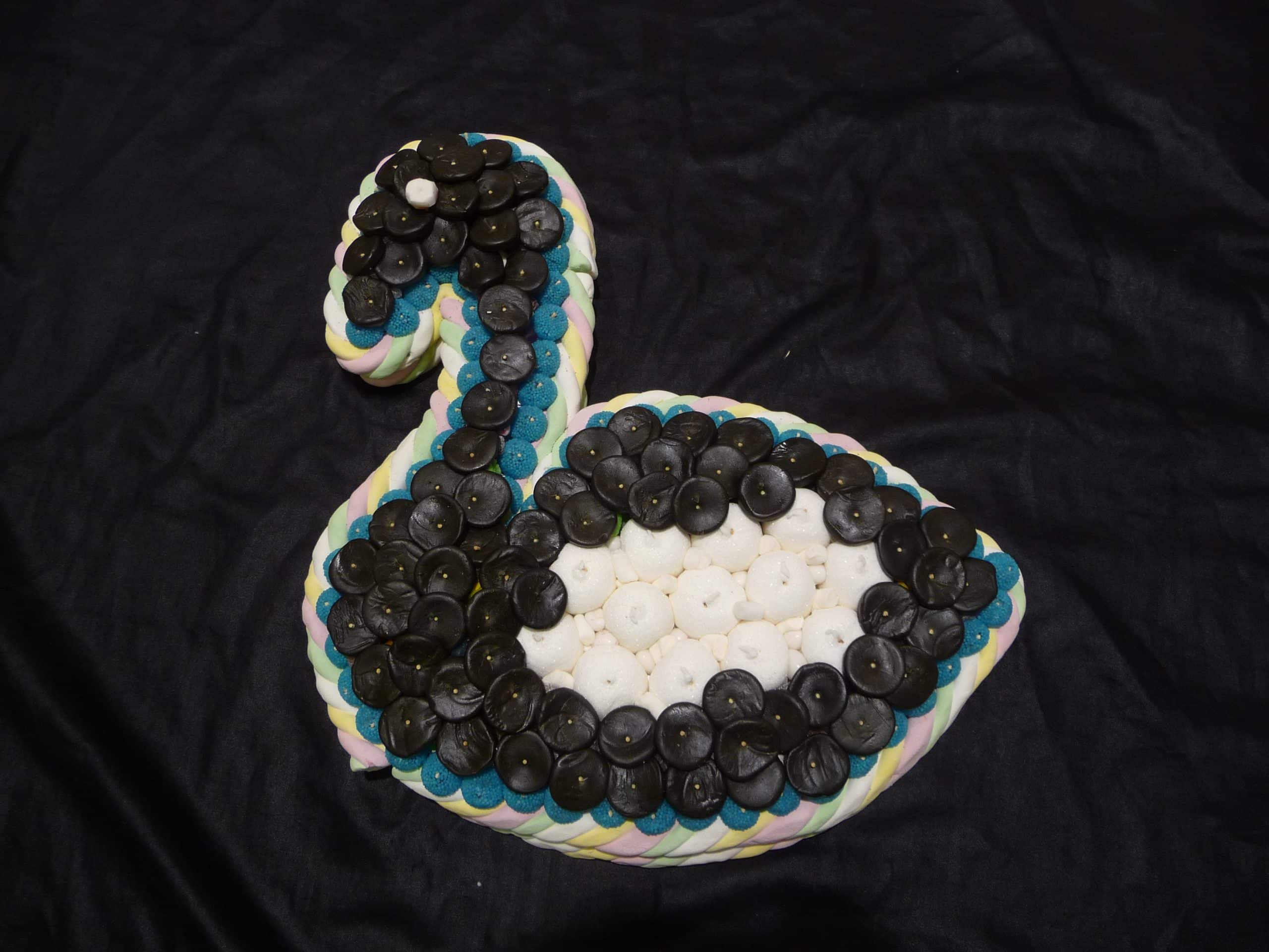 Gâteau de bonbons en forme de cygne noir, contenant au moins 1kg800 de bonbons. Contour en marshmallow avec à l’intérieur des minis confiseries de 10 variétés différentes.