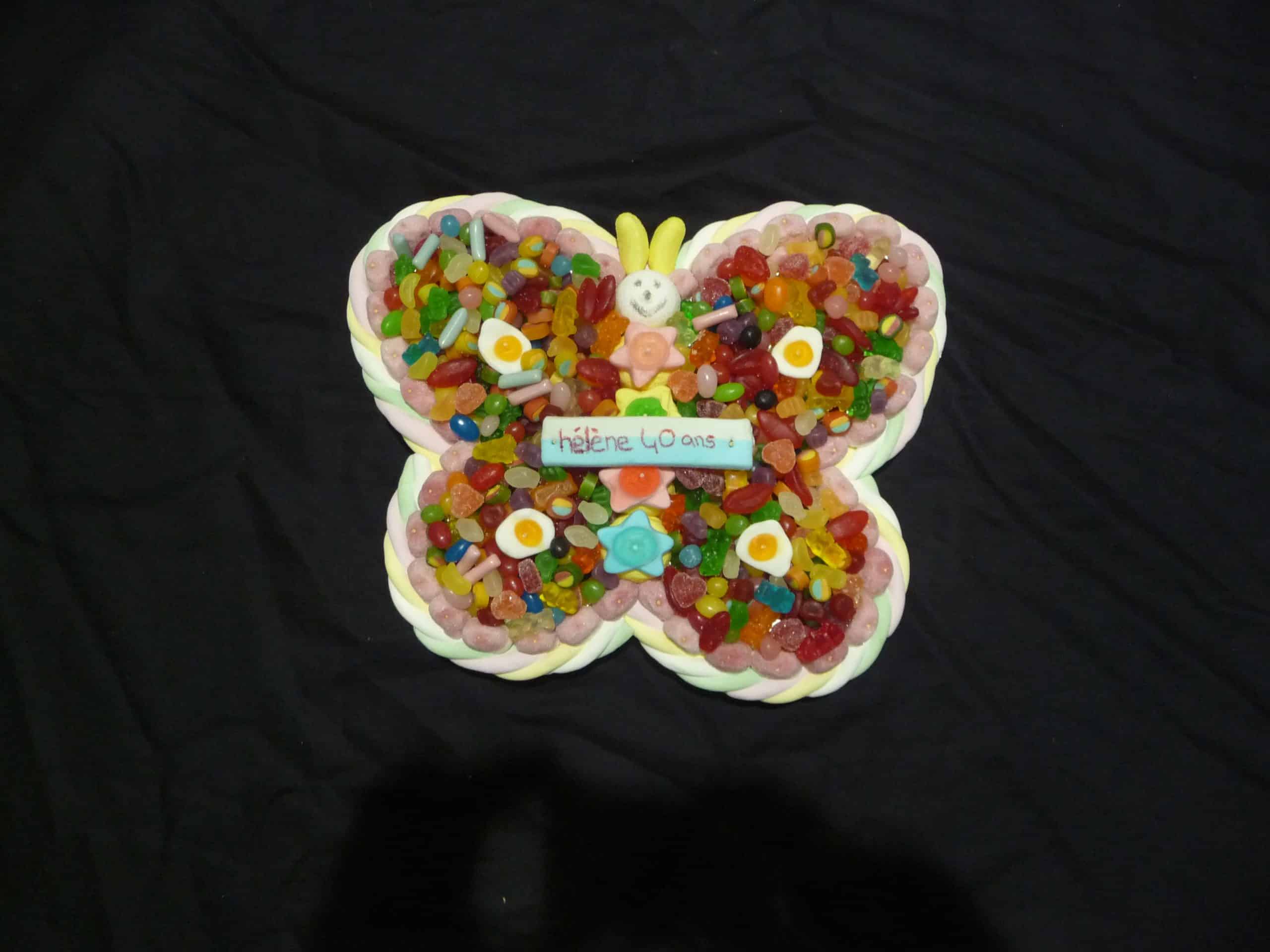 Gâteau de bonbons en forme de papillon. Contour en marshmallow. Intérieur garni de mini confiseries.