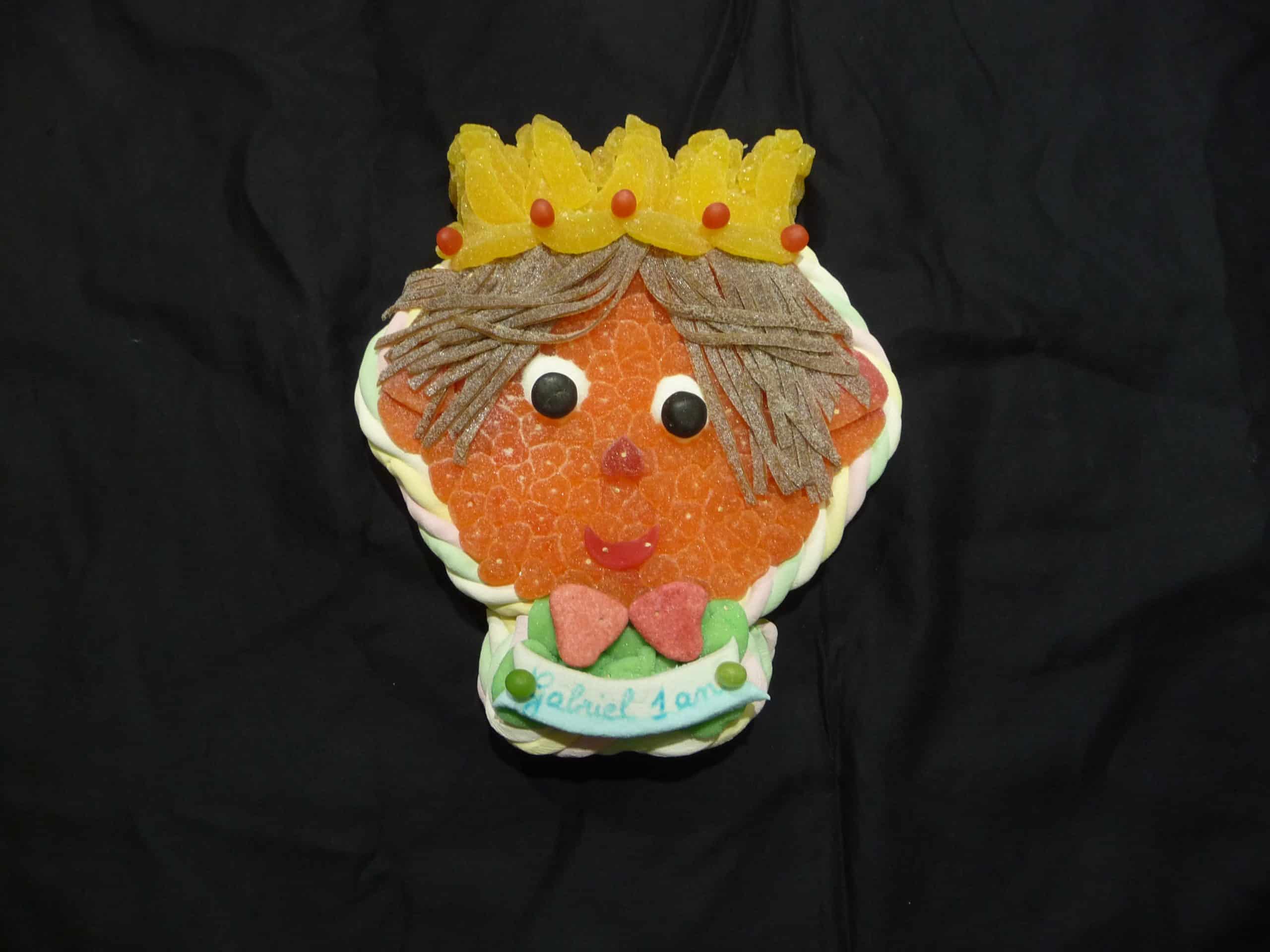 Gâteau de bonbons en forme de tête du Petit Prince, contenant au minimum 1kg200 de bonbons. Contour en marshmallow avec à l’intérieur des minis confiseries de 10 variétés différentes.