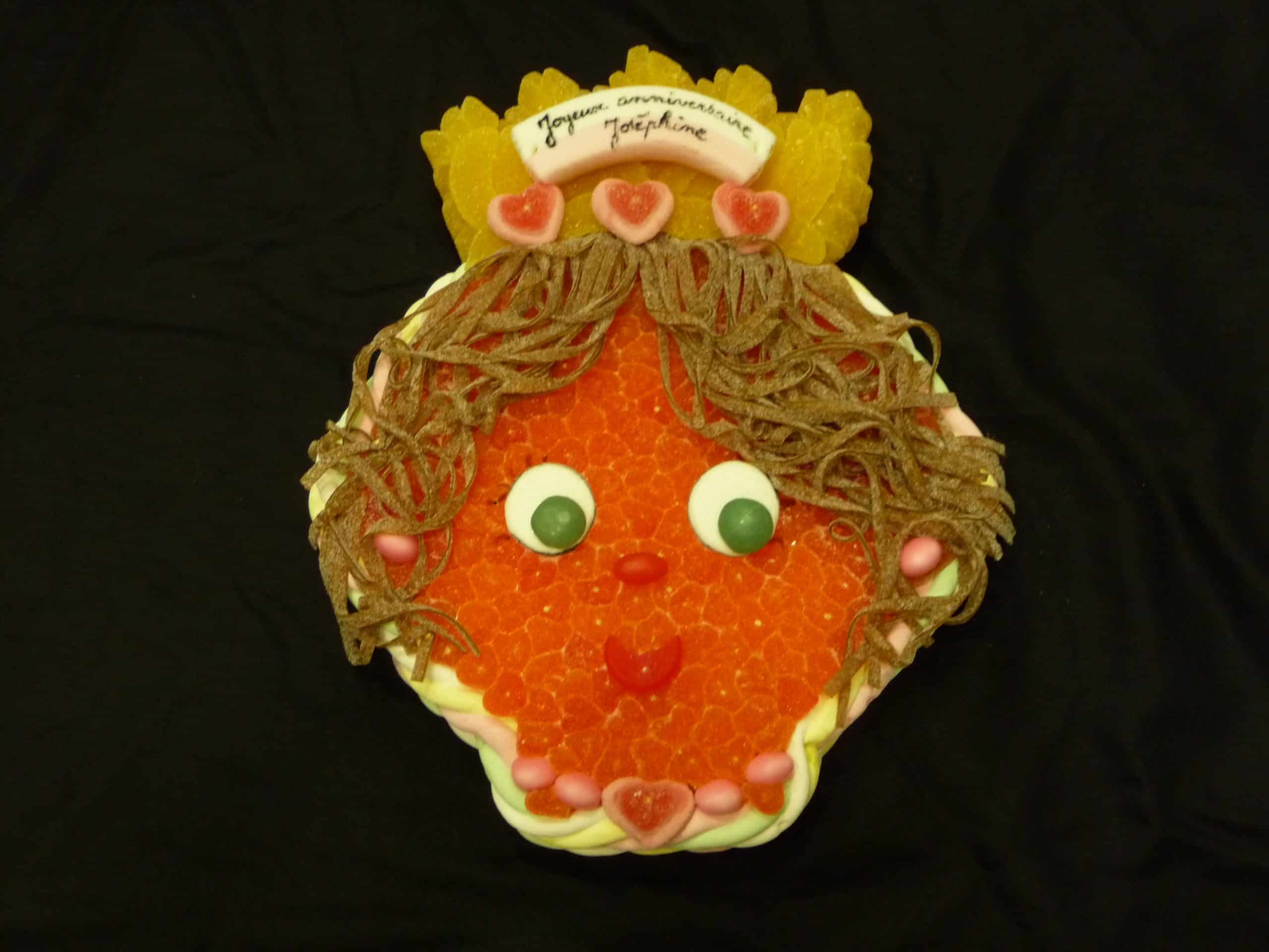 Gâteau de bonbons en forme de tête de princesse, contenant au minimum 1kg200 de bonbons. Contour en marshmallow avec à l’intérieur des minis confiseries de 10 variétés différentes.