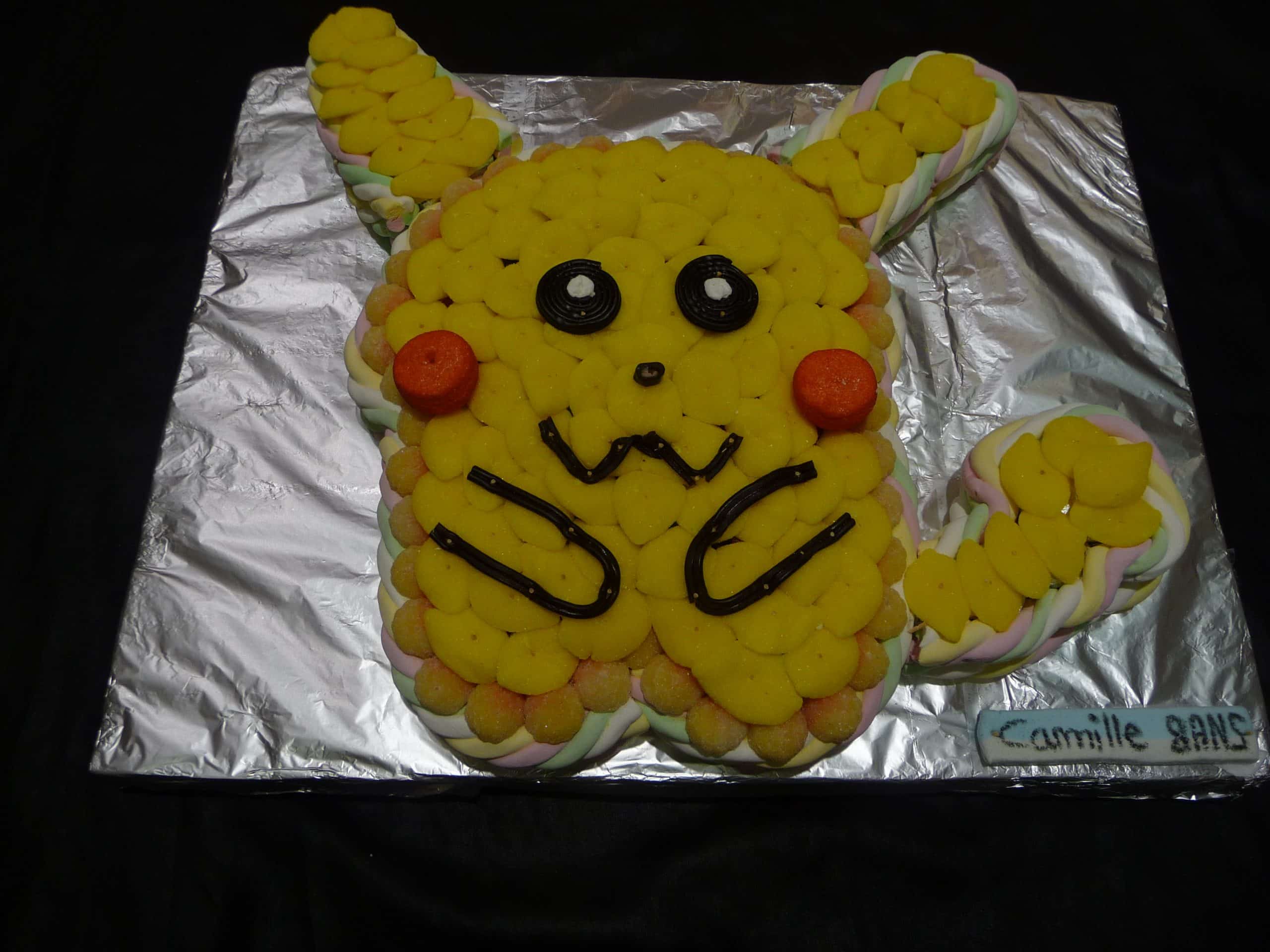Gâteau de bonbons en forme de Pikachu. Contour en marshmallow. Intérieur garni de petites confiseries.