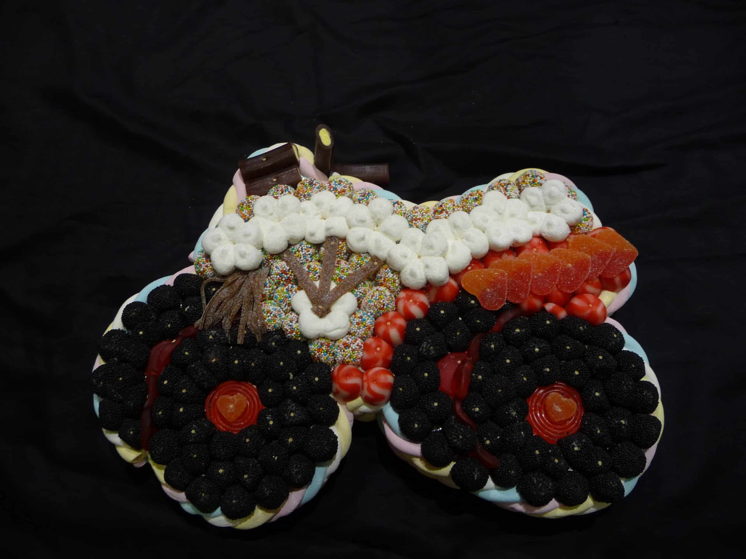 Gâteau de bonbons en forme de Quad, contenant au minimum 1,2 kg de bonbons. Contour en marshmallow avec à l’intérieur un mélange de petites confiseries de 10 variétés différentes.
