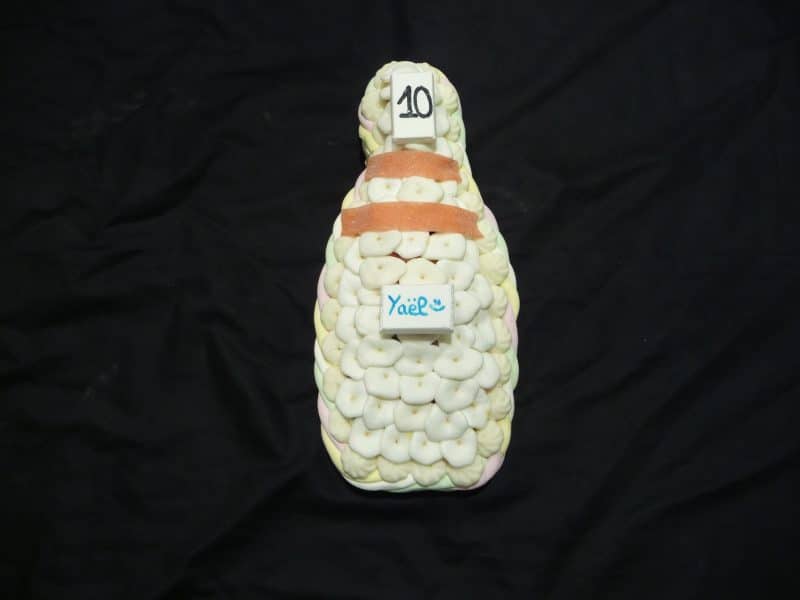 Gâteau de bonbons en forme de quille de bowling, contenant au minimum 900 g de bonbons. Contour en marshmallow avec à l’intérieur des minis confiseries de 10 variétés différentes.