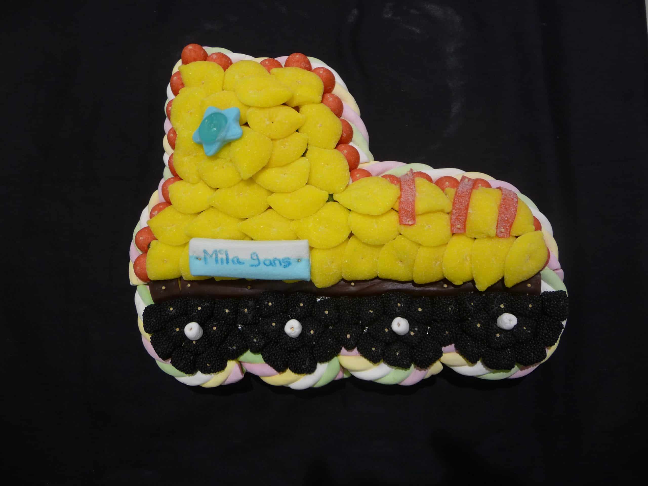 Gâteau de bonbons en forme de roller. Le contour est réalisé en marshmallow. L’intérieur du roller est rempli d’un mélange de petites confiseries.