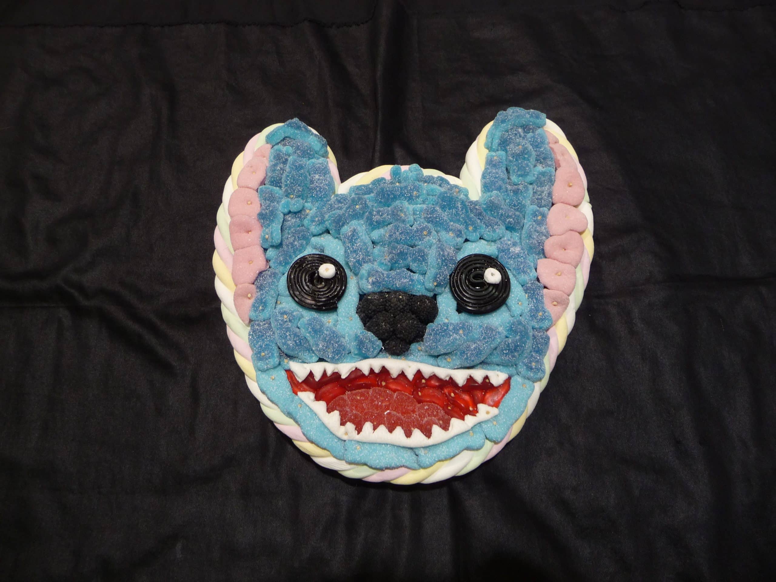 Gâteau de bonbons en forme de tête de Stitch, contenant au minimum 1kg200 de bonbons. Contour en marshmallow avec à l’intérieur des minis confiseries de 10 variétés différentes.