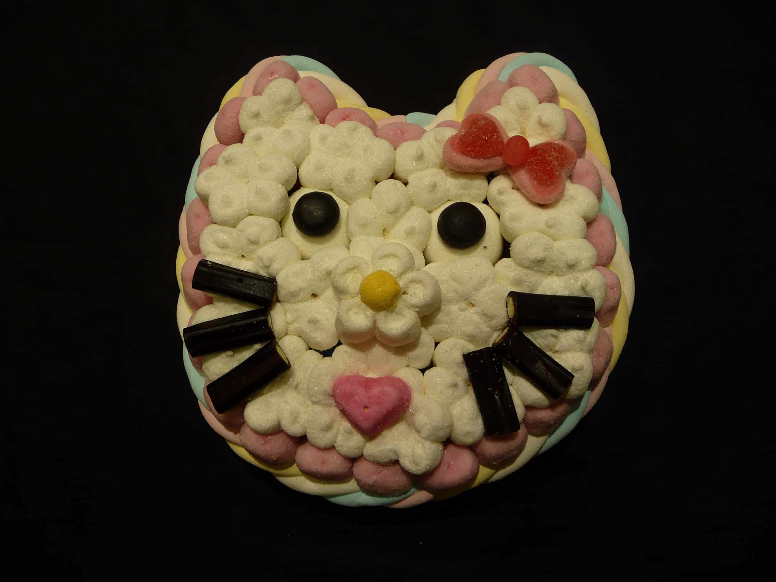 Gâteau de bonbons en forme de tête d’Hello Kitty. Intérieur garni d’un mélange de petites confiseries. Le tour est composé de 2 tresses de guimauve.