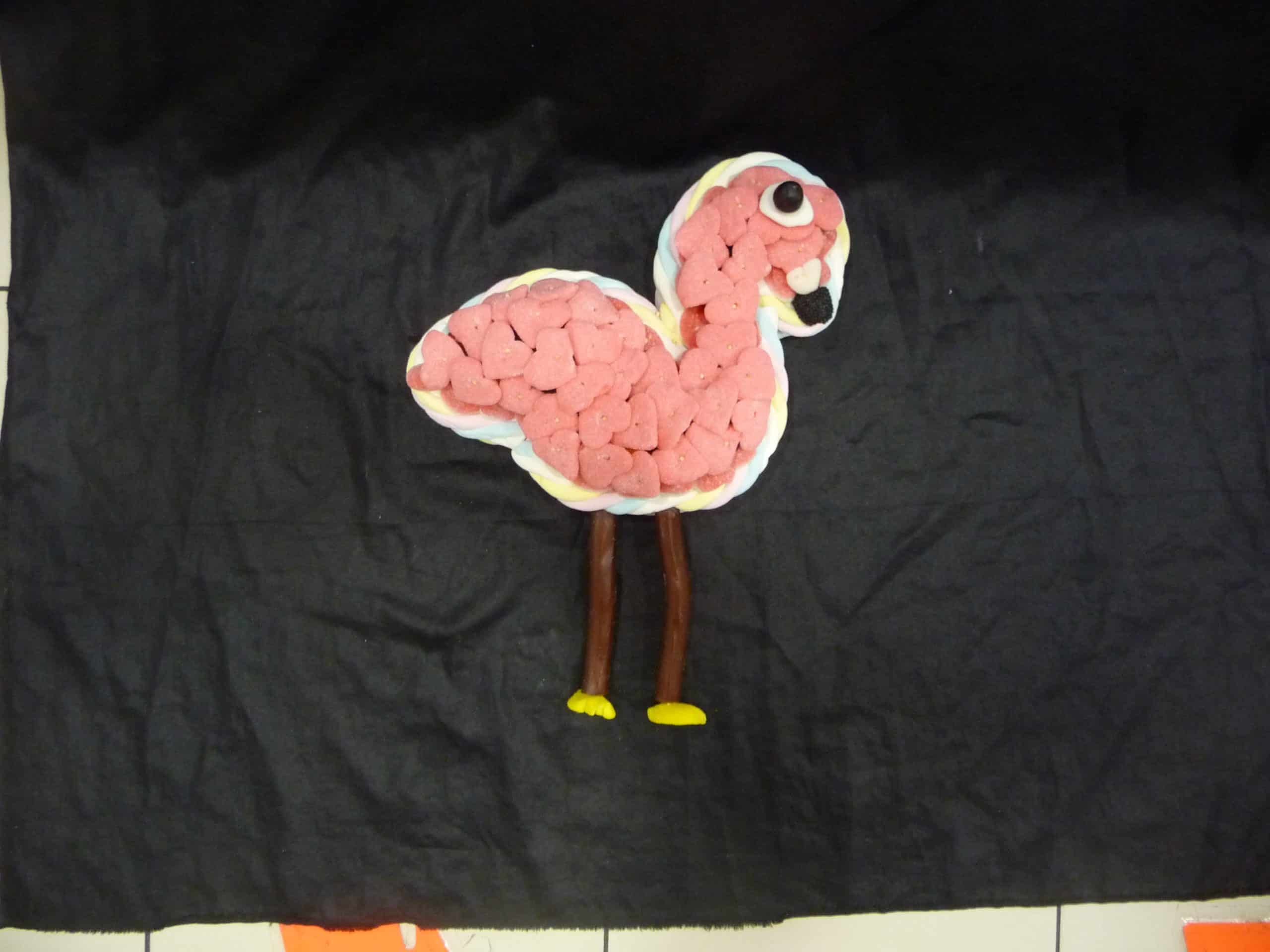 Gâteau de bonbons en forme de flamant rose, contenant au moins 900 g de bonbons. Contour en marshmallow avec à l’intérieur des minis confiseries de 10 variétés différentes.