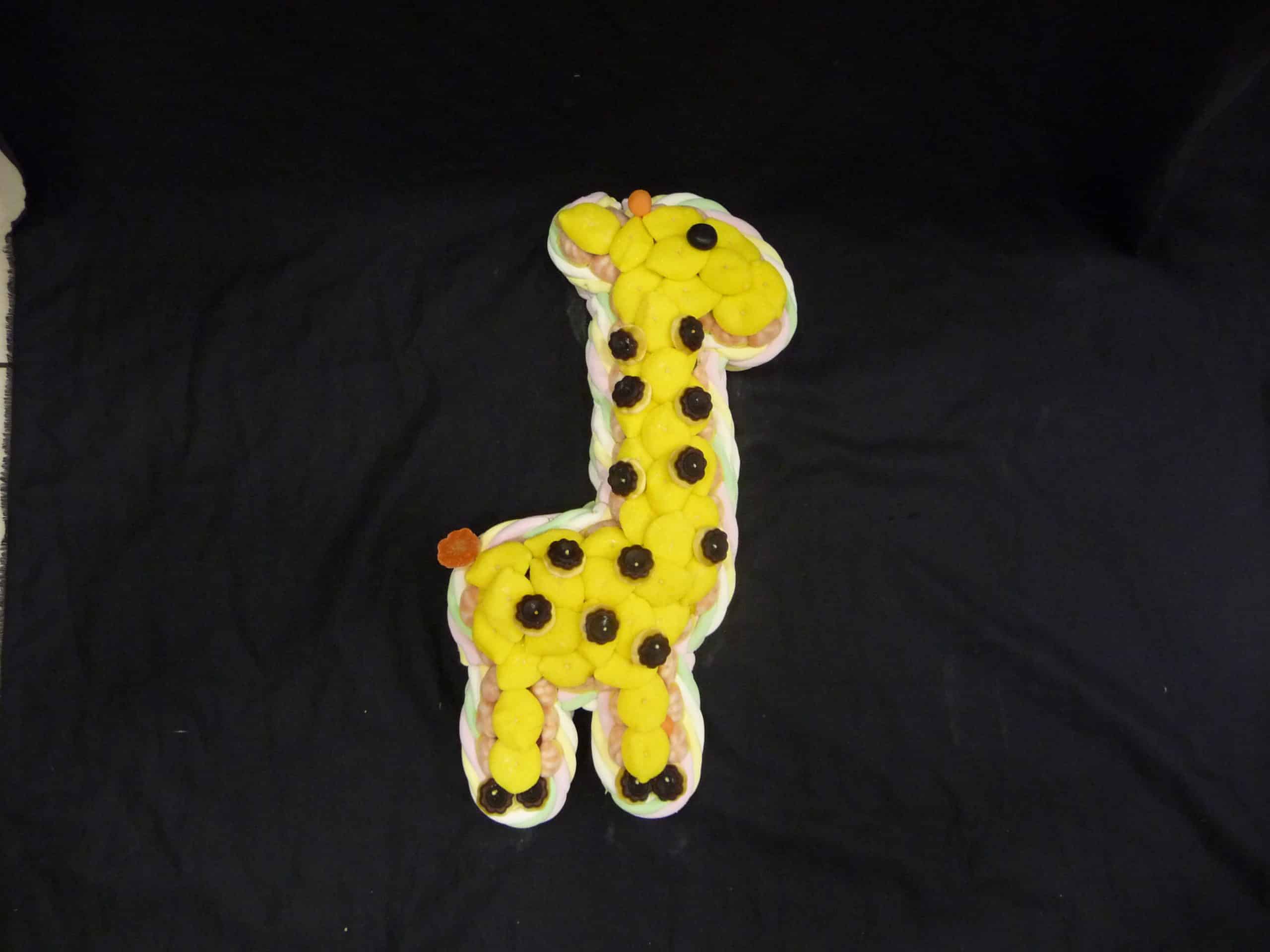 Gâteau de bonbons en forme de girafe, contenant au moins 1,200kg de bonbons. Contour en marshmallow avec à l’intérieur des minis confiseries de 10 variétés différentes.