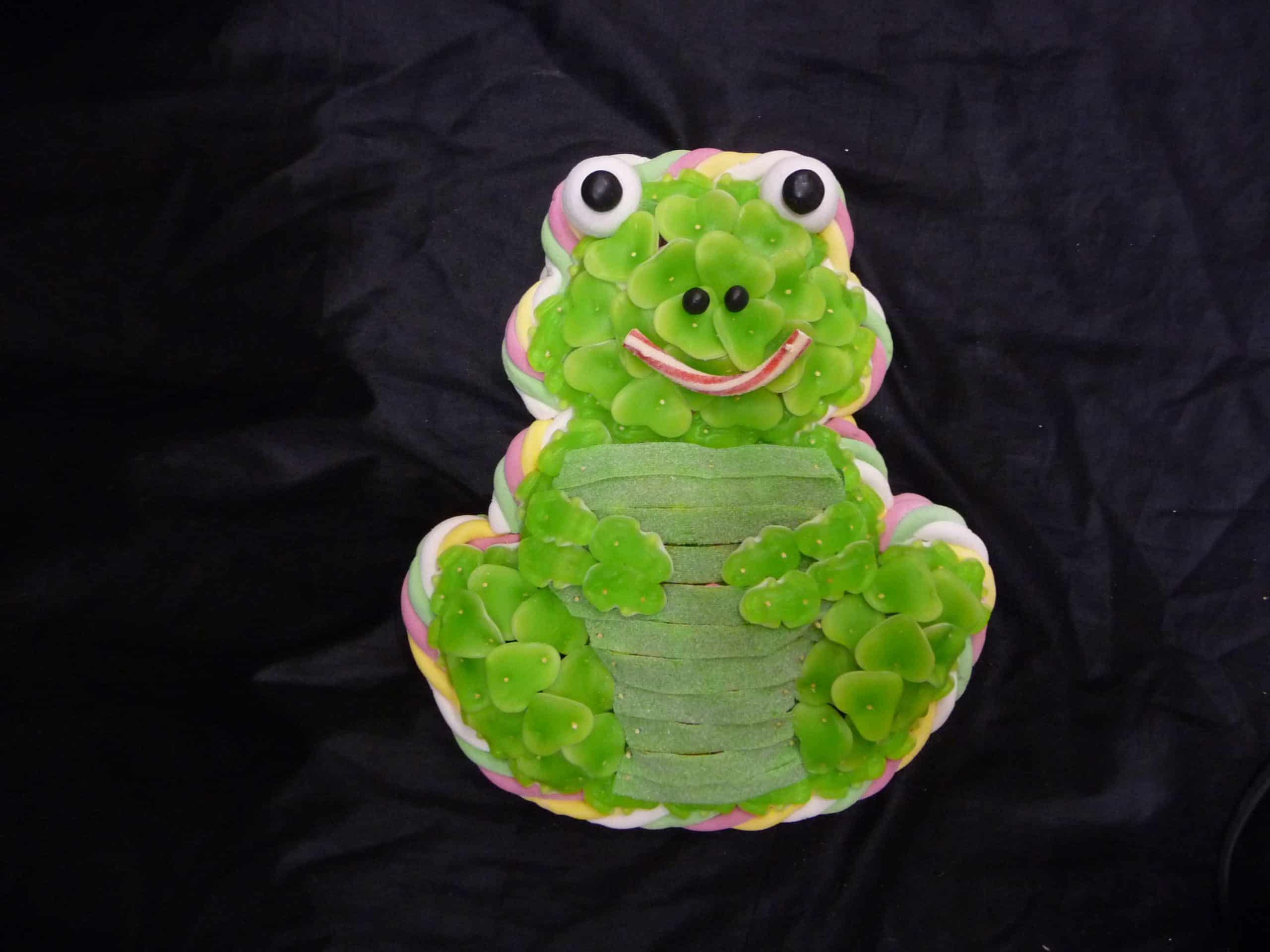Gâteau de bonbons en forme de grenouille, contenant au moins 1500 g de bonbons. Contour en marshmallow avec à l’intérieur des minis confiseries de 10 variétés différentes.