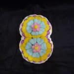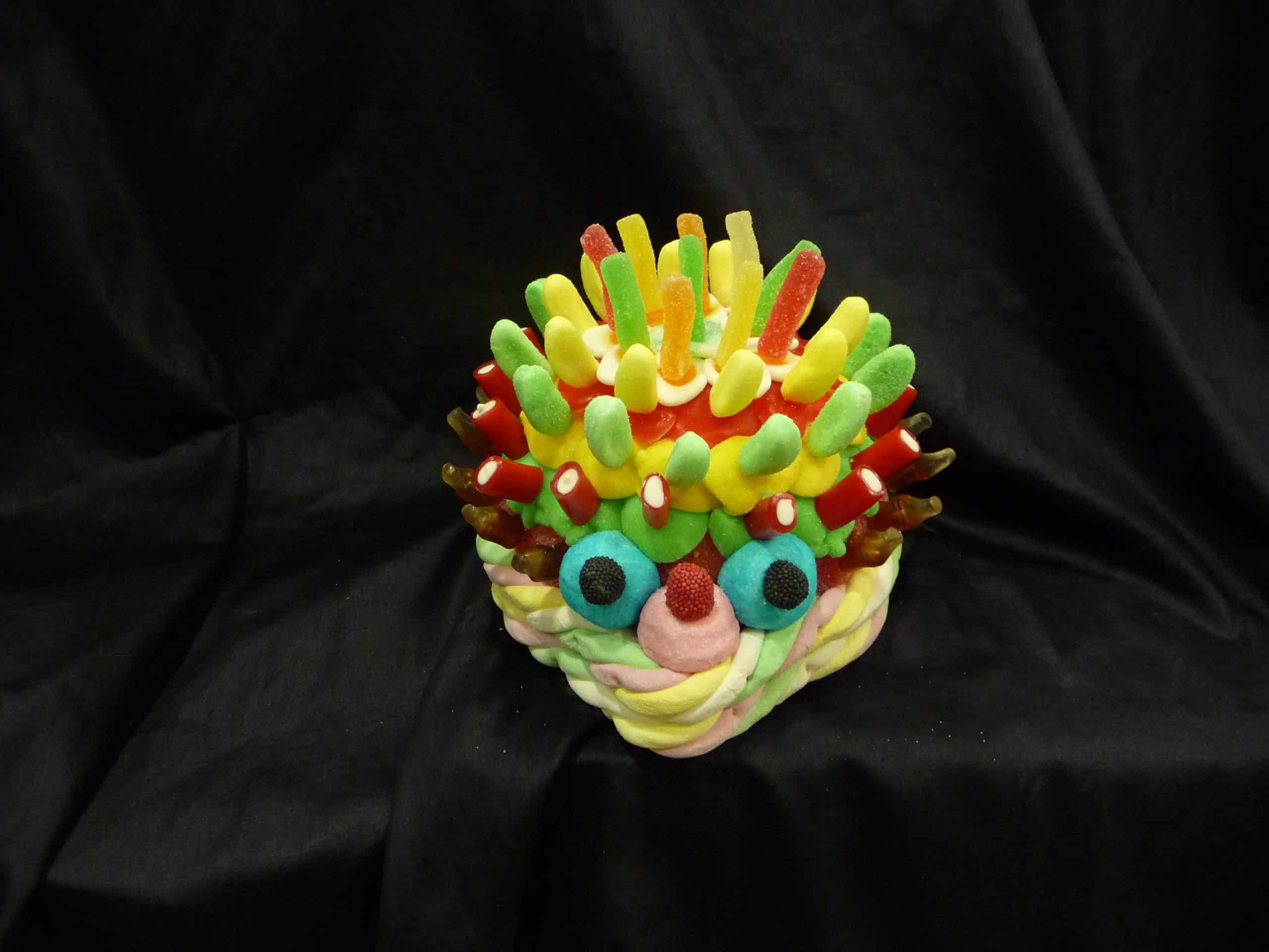Gâteau de bonbons en forme de hérisson. Tous les bonbons sont piqués. À chaque pic, il y a un bonbon à la base et un bonbon sur le pic.
