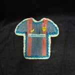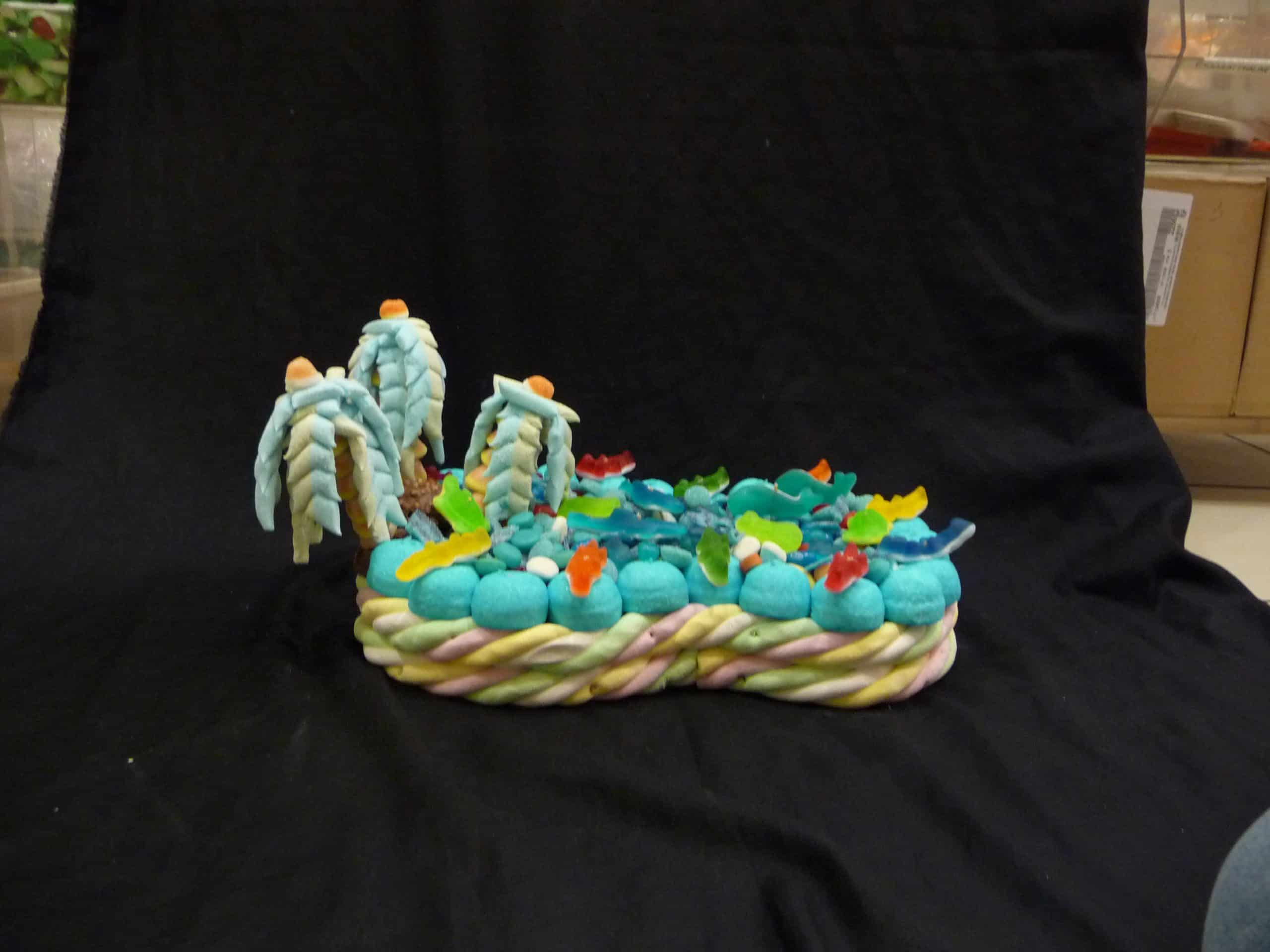 Gâteau de bonbons en forme d’île. Le contour est en marshmallow. Intérieur garni d’un mélange de petites confiseries. Pour le transport les palmiers sont démontés.