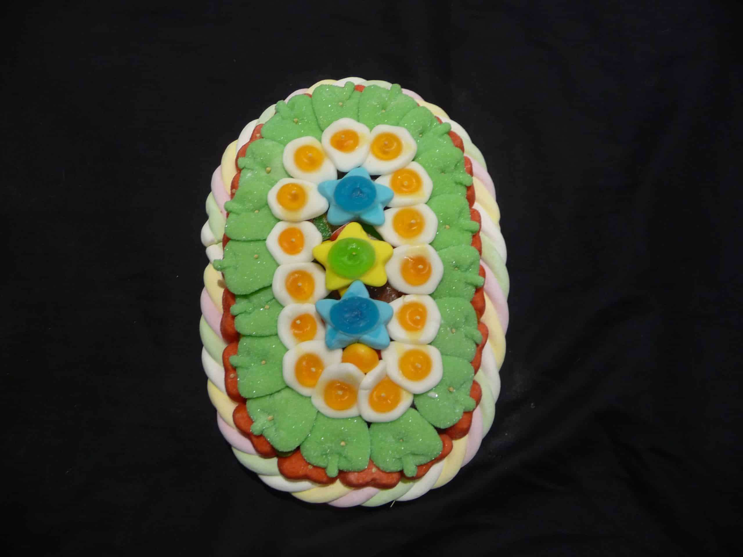 Gâteau de bonbons en forme de lettre ” O “, contenant au minimum 700g de bonbons. Contour en marshmallow avec à l’intérieur des minis confiseries de 10 variétés différentes.