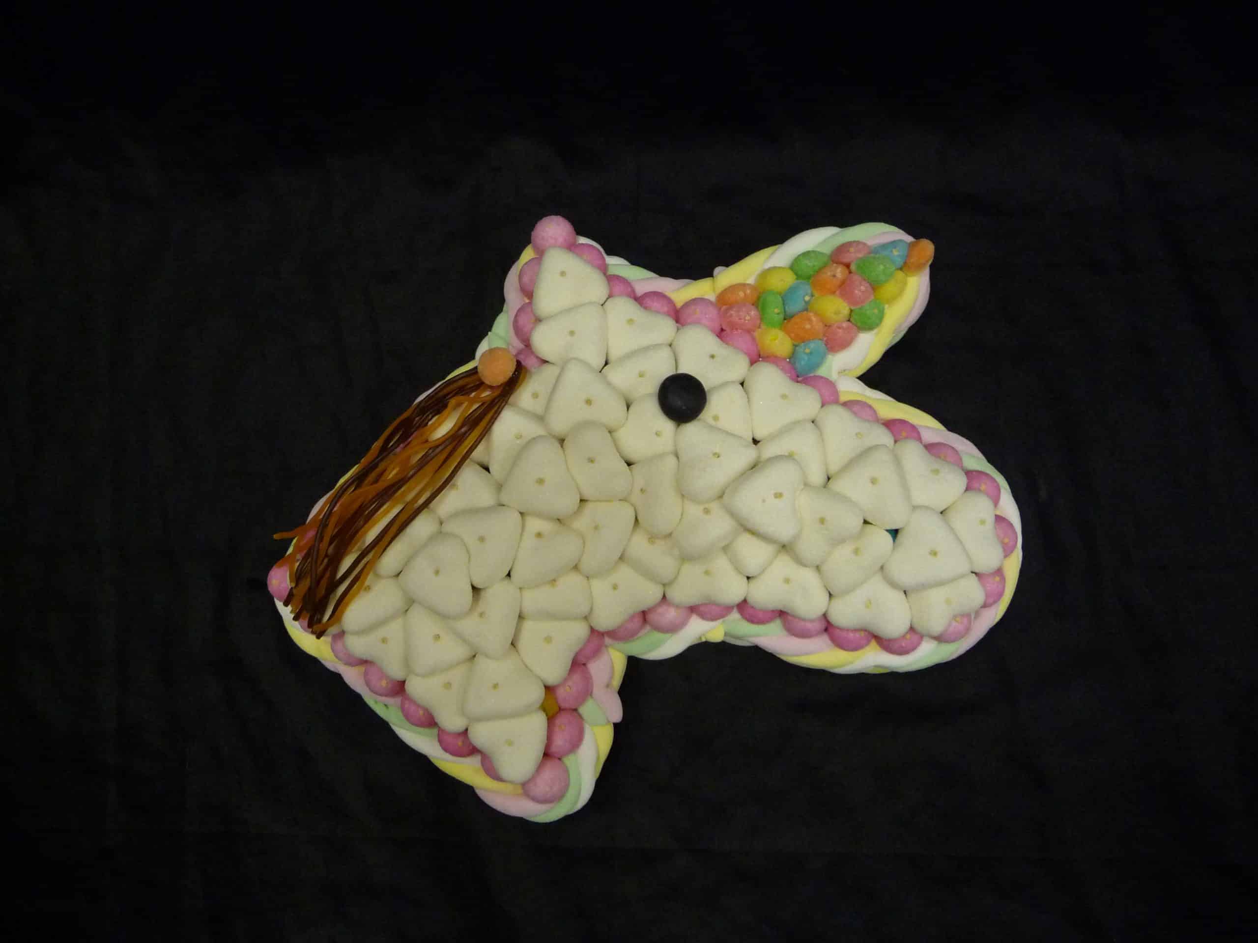 Gâteau de bonbons en forme de licorne, contenant au moins 1,200kg de bonbons. Contour en marshmallow avec à l’intérieur des minis confiseries de 10 variétés différentes.