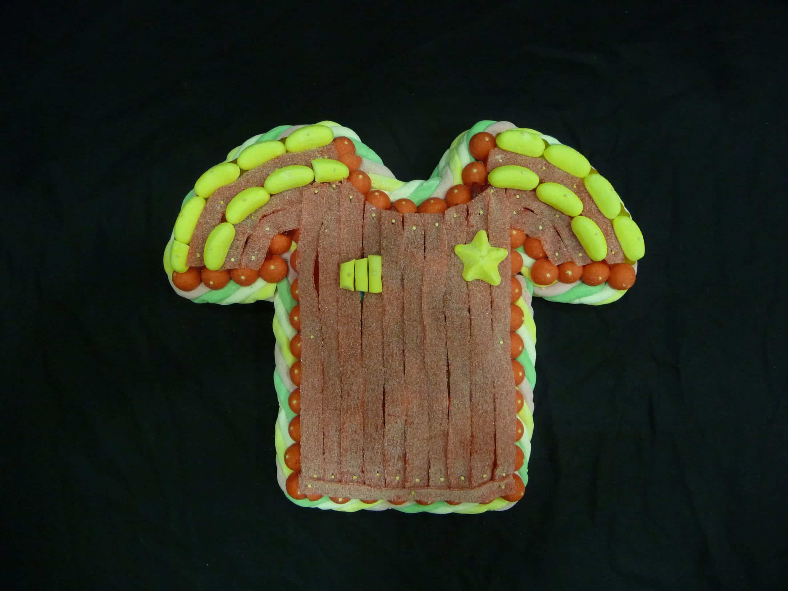 Gâteau de bonbons en forme de maillot de football de l’équipe d’Espagne. Contour en marshmallow. Intérieur garni de petites confiseries.