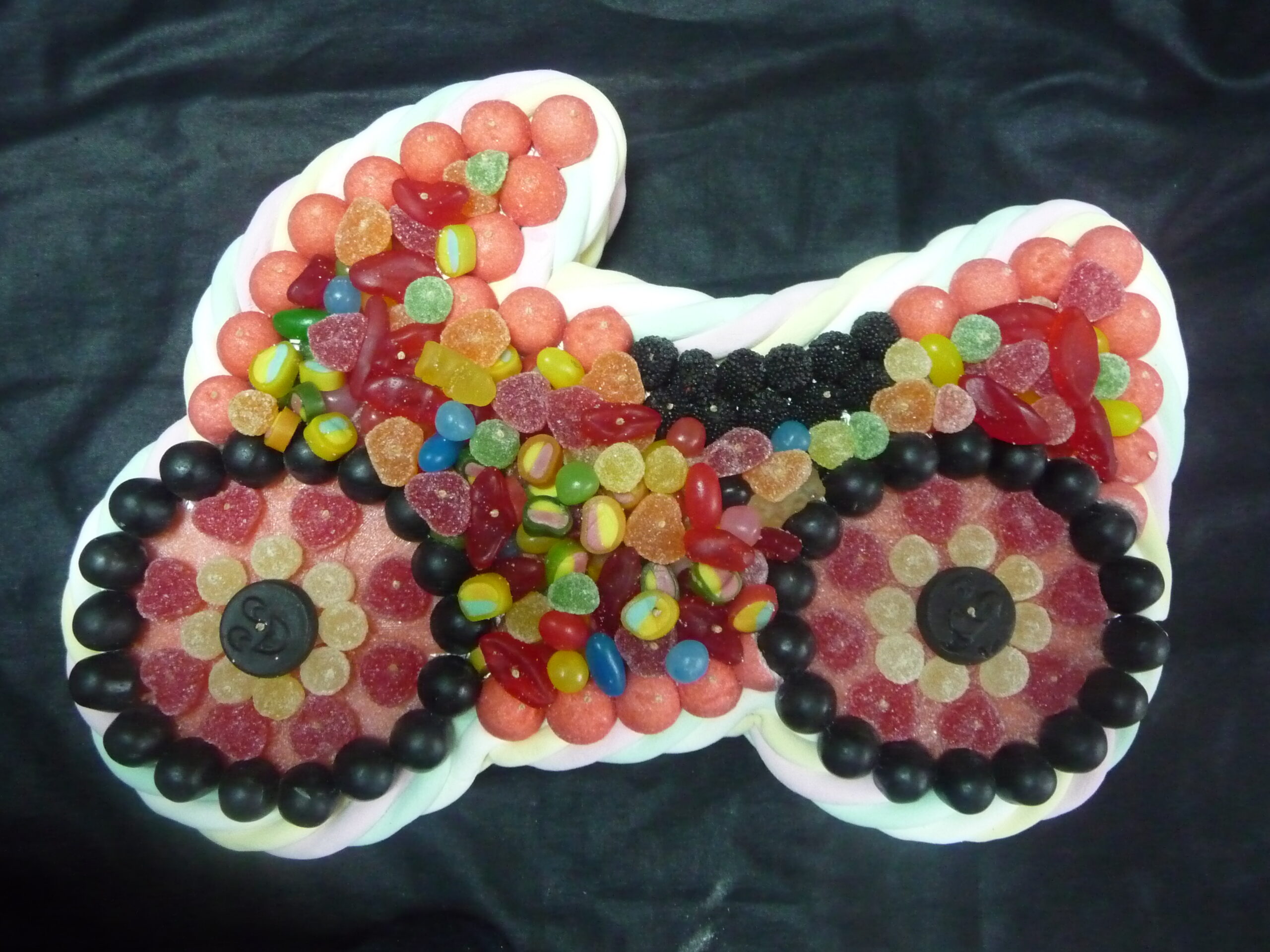 Gâteau de bonbons en forme de moto, contenant au moins 900 g de bonbons. Contour en marshmallow avec à l’intérieur des minis confiseries de 10 variétés différentes.