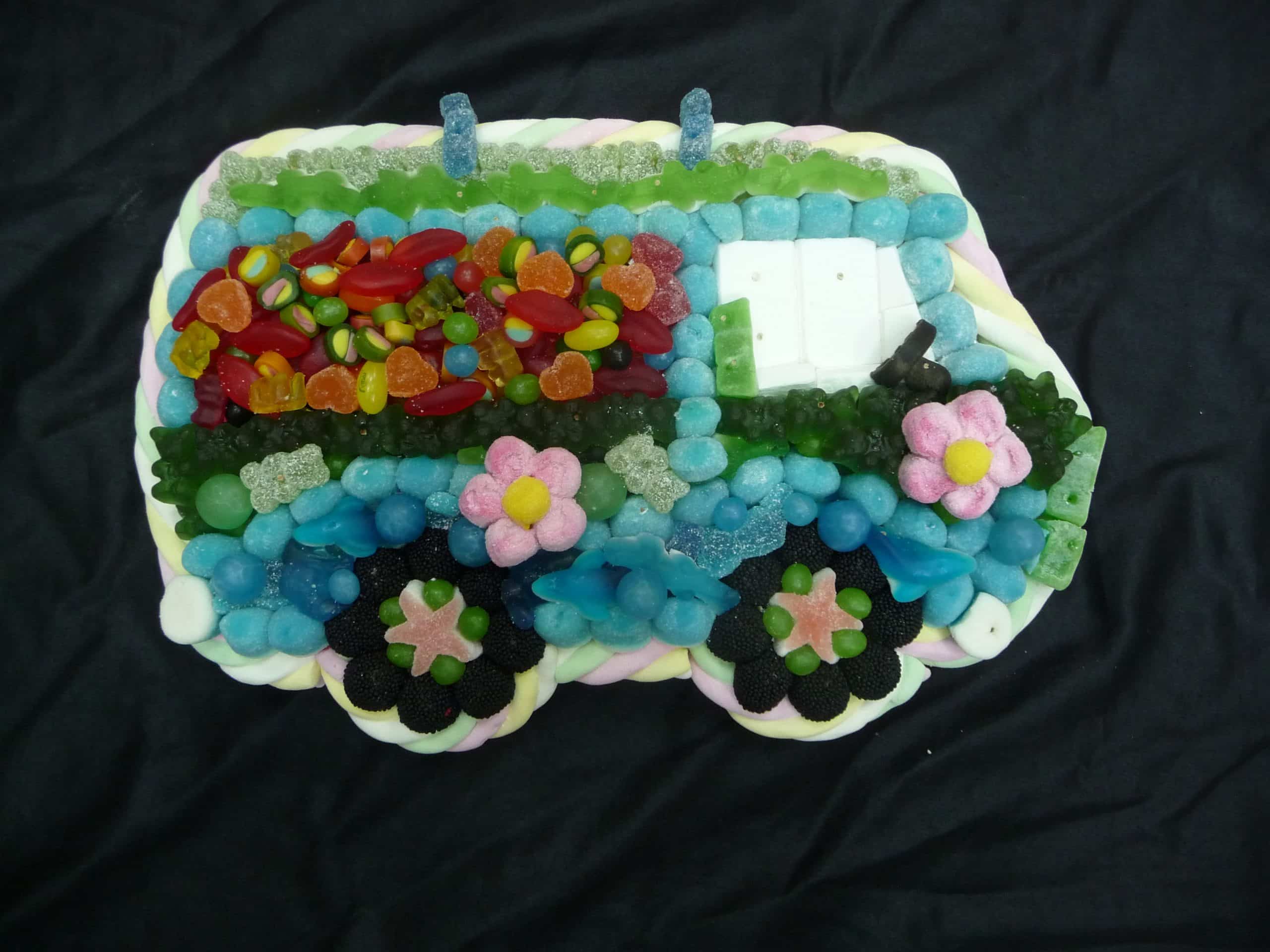 Gâteau de bonbons en forme de Mystery Machine. Le contour est en marshmallow. Intérieur garni d’un mélange de petites confiseries.
