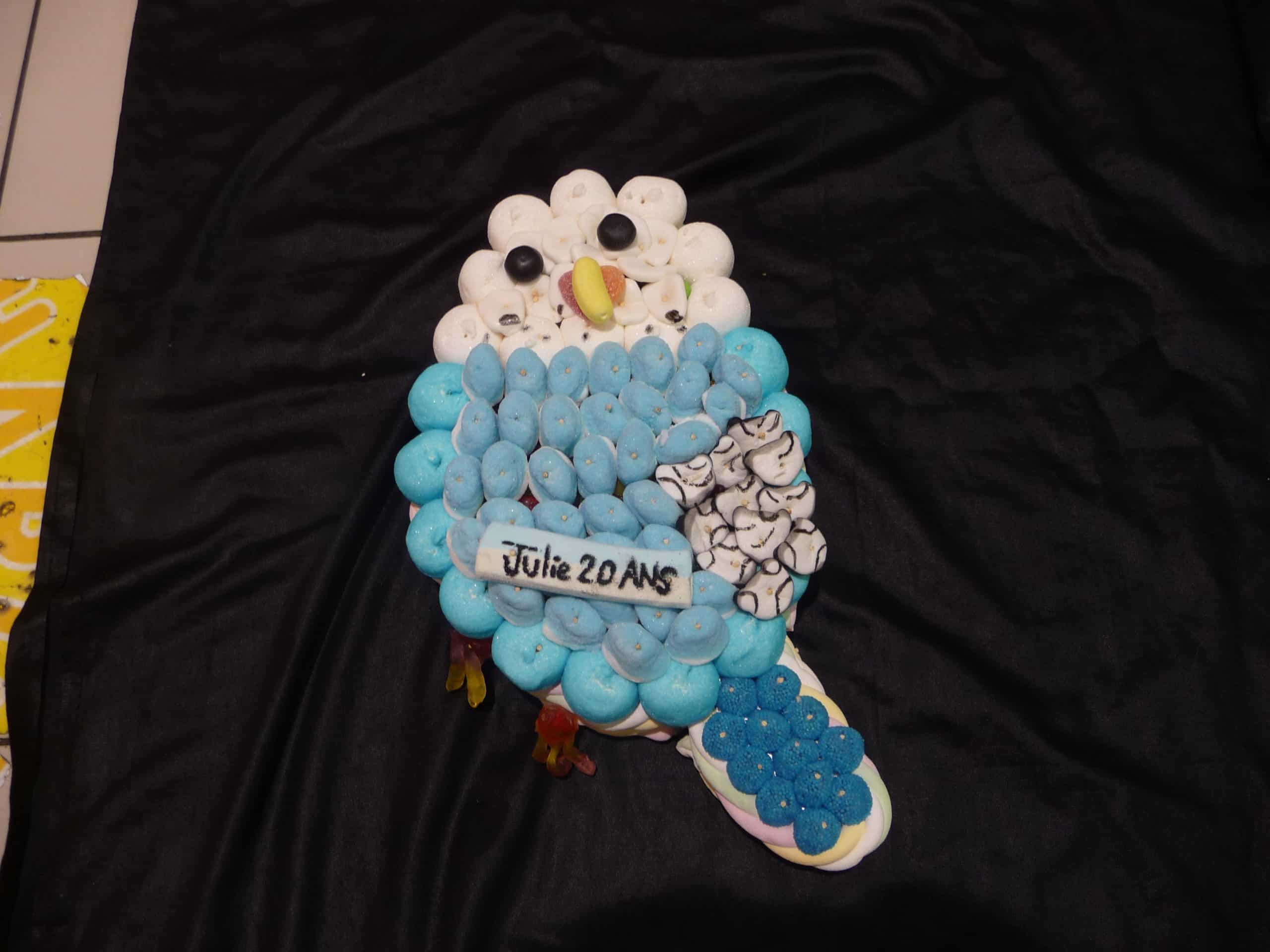 Gâteau de bonbons en forme de perruche, contenant au moins 1,200kg de bonbons. Contour en marshmallow avec à l’intérieur des minis confiseries de 10 variétés différentes.