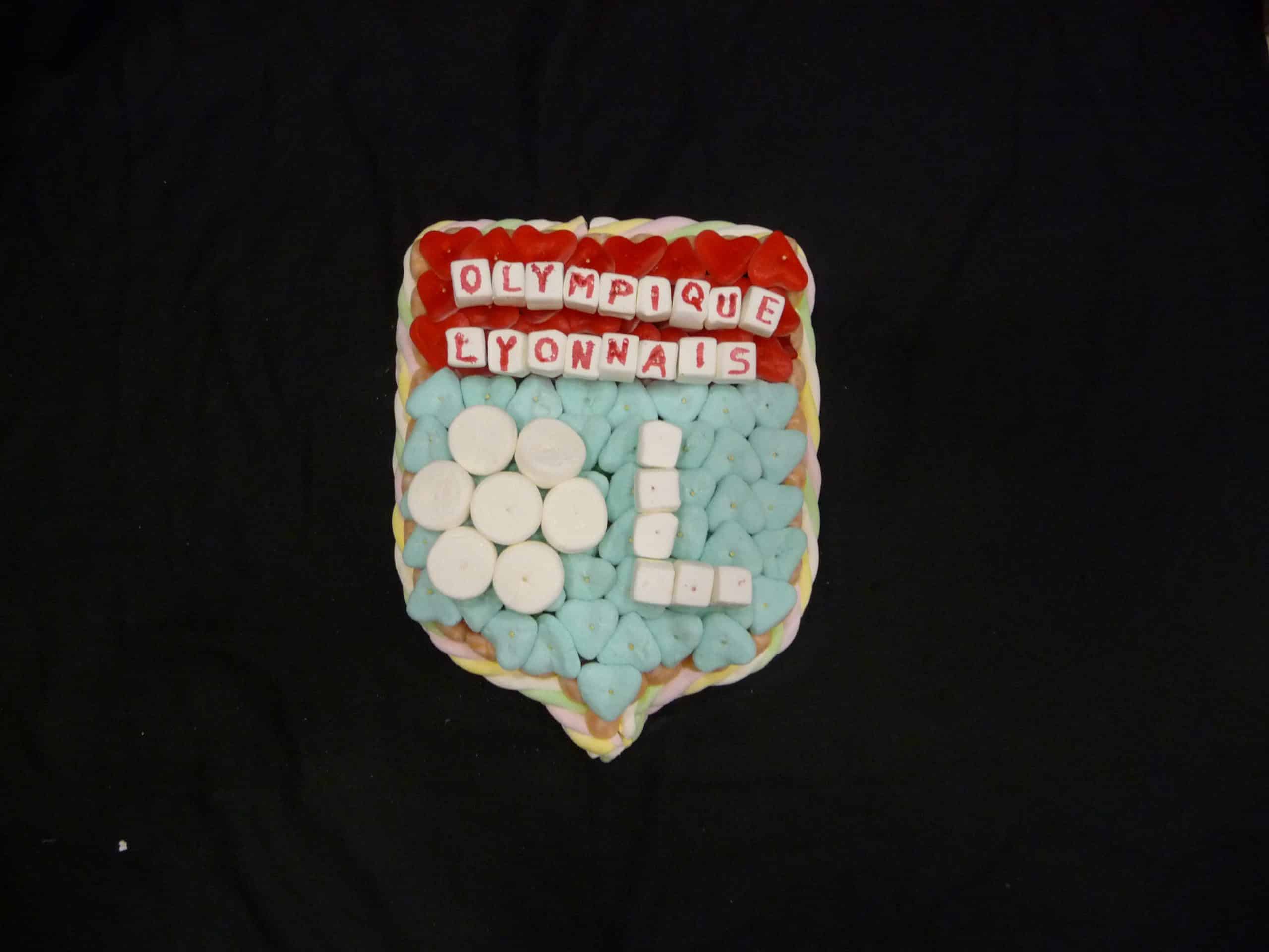 Gâteau de bonbons en forme du blason de l’Olympique Lyonnais, contenant au moins 1kg500 de bonbons. Contour en marshmallow avec à l’intérieur des minis confiseries de 10 variétés différentes.