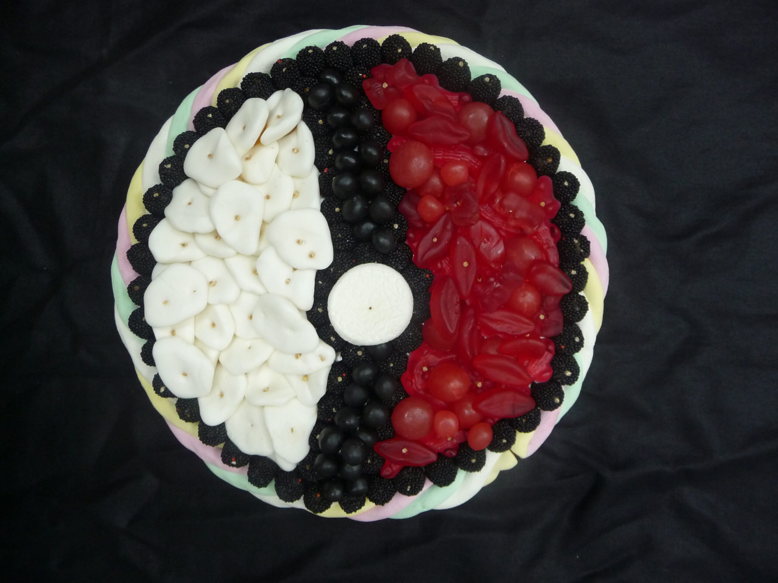 Gâteau de bonbons en forme d’une Pokeball de Pokemon. Le contour est en marshmallow. Intérieur garni d’un mélange de petites confiseries.
