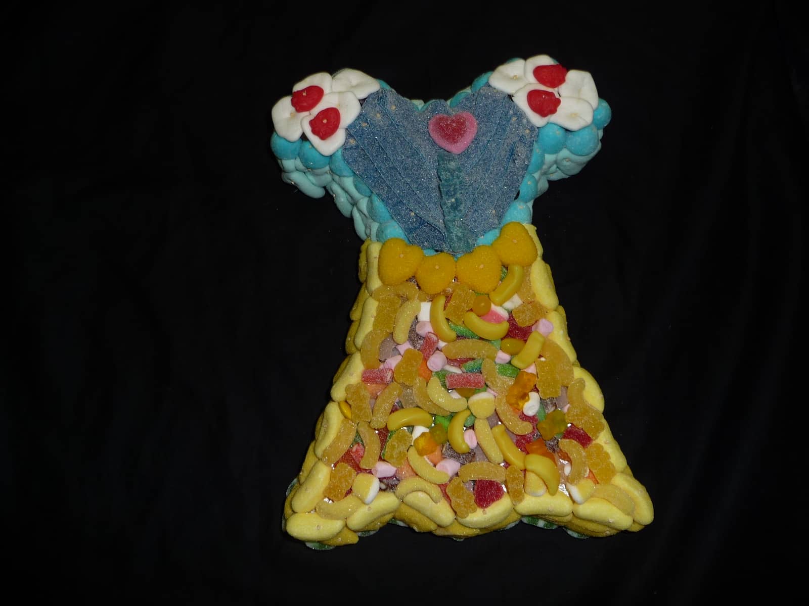 Gâteau de bonbons en forme de robe. Le contour est en marshmallow. Intérieur garni d’un mélange de petites confiseries.