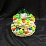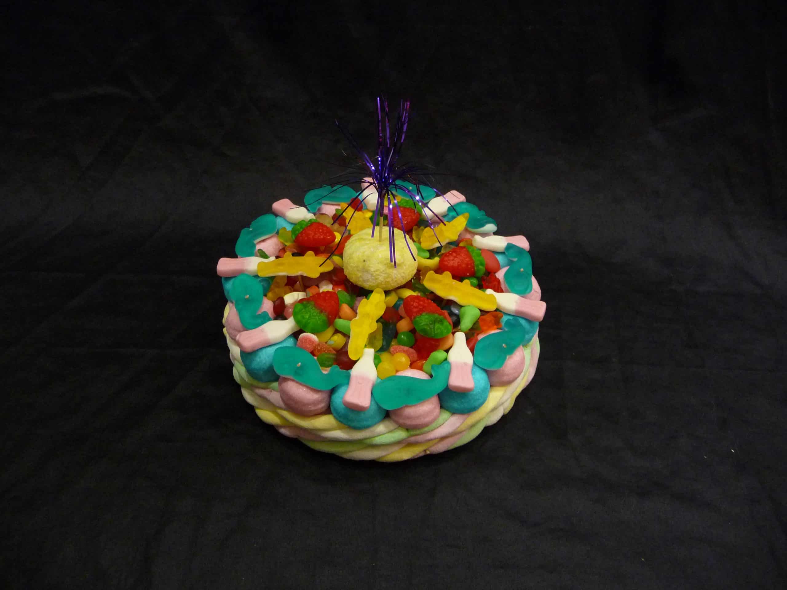 Gâteau de bonbons rond de 20 cm de diamètre. Le tour est en marshmallow. L’intérieur est garni d’un mélange de petites confiseries.