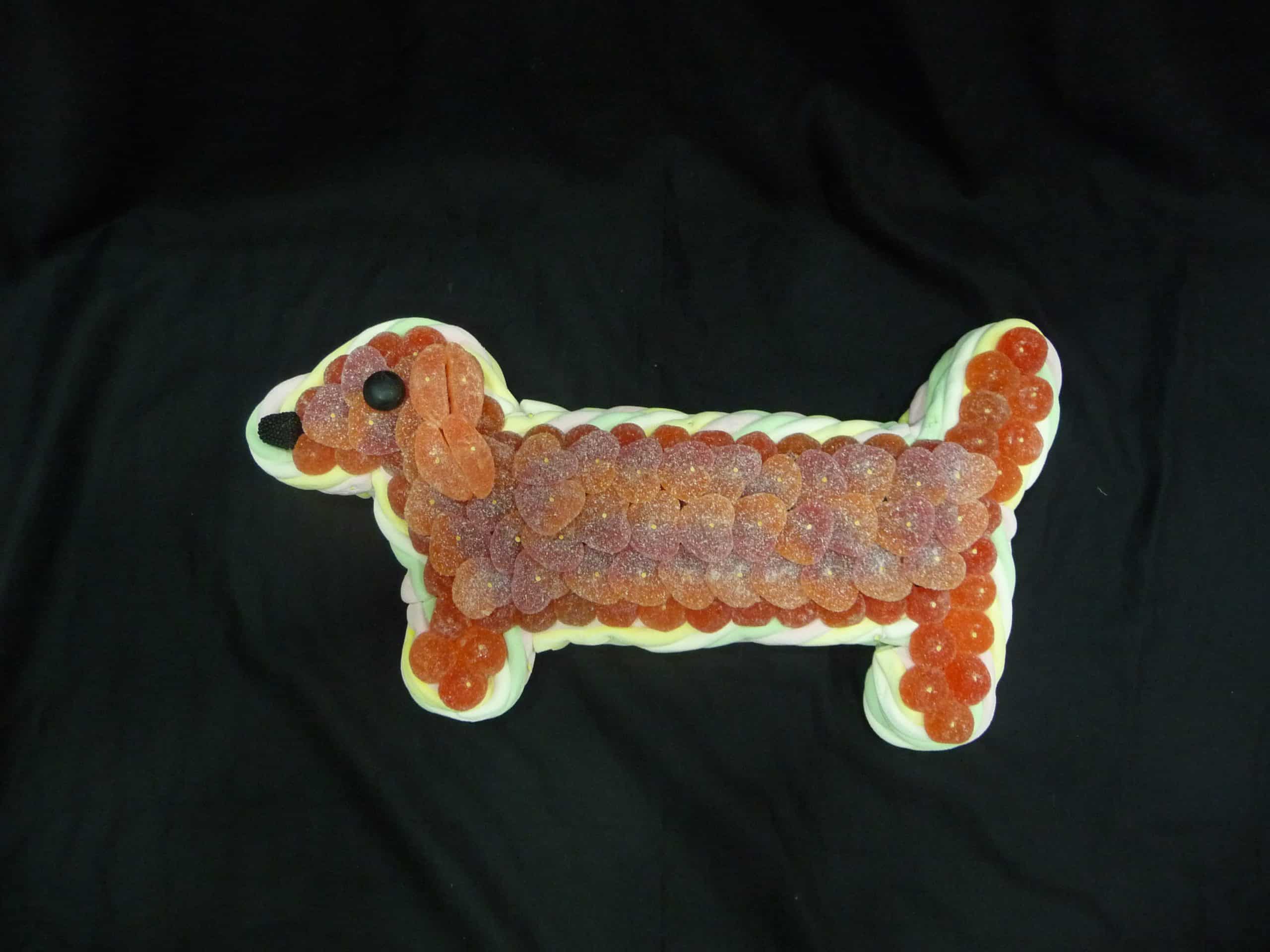Gâteau de bonbons en forme de teckel à poil ras, contenant au moins 900 g de bonbons. Contour en marshmallow avec à l’intérieur des minis confiseries de 10 variétés différentes.
