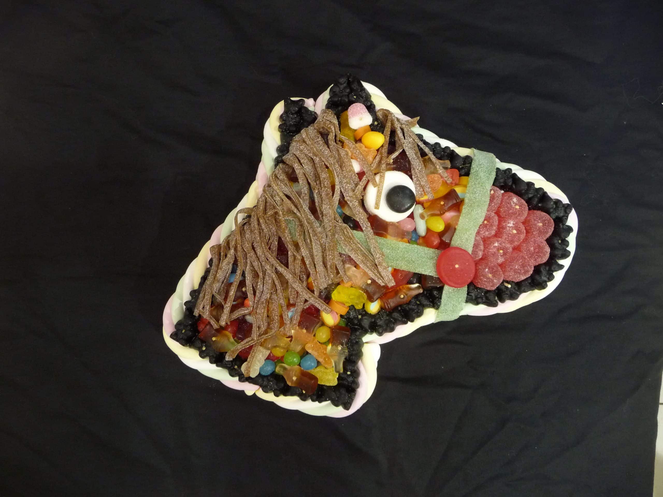 Gâteau de bonbons en forme de tête de cheval, contenant au minimum 900 g de bonbons. Contour en marshmallow avec à l’intérieur des minis confiseries de 10 variétés différentes.