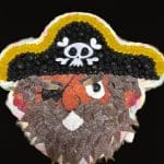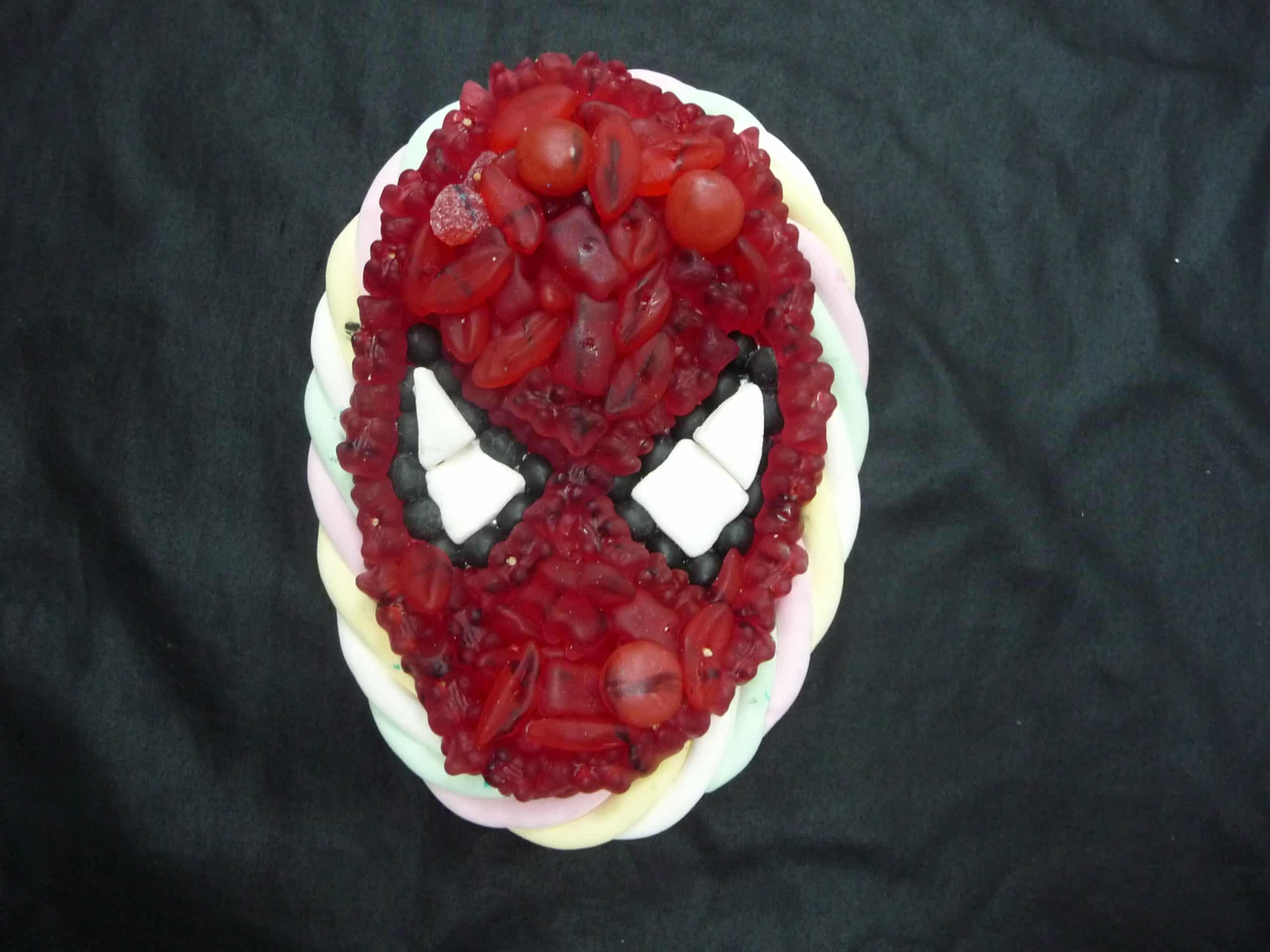 Gâteau de bonbons en forme de tête de Spider-man. Contour en marshmallow. Intérieur garni de petites confiseries.