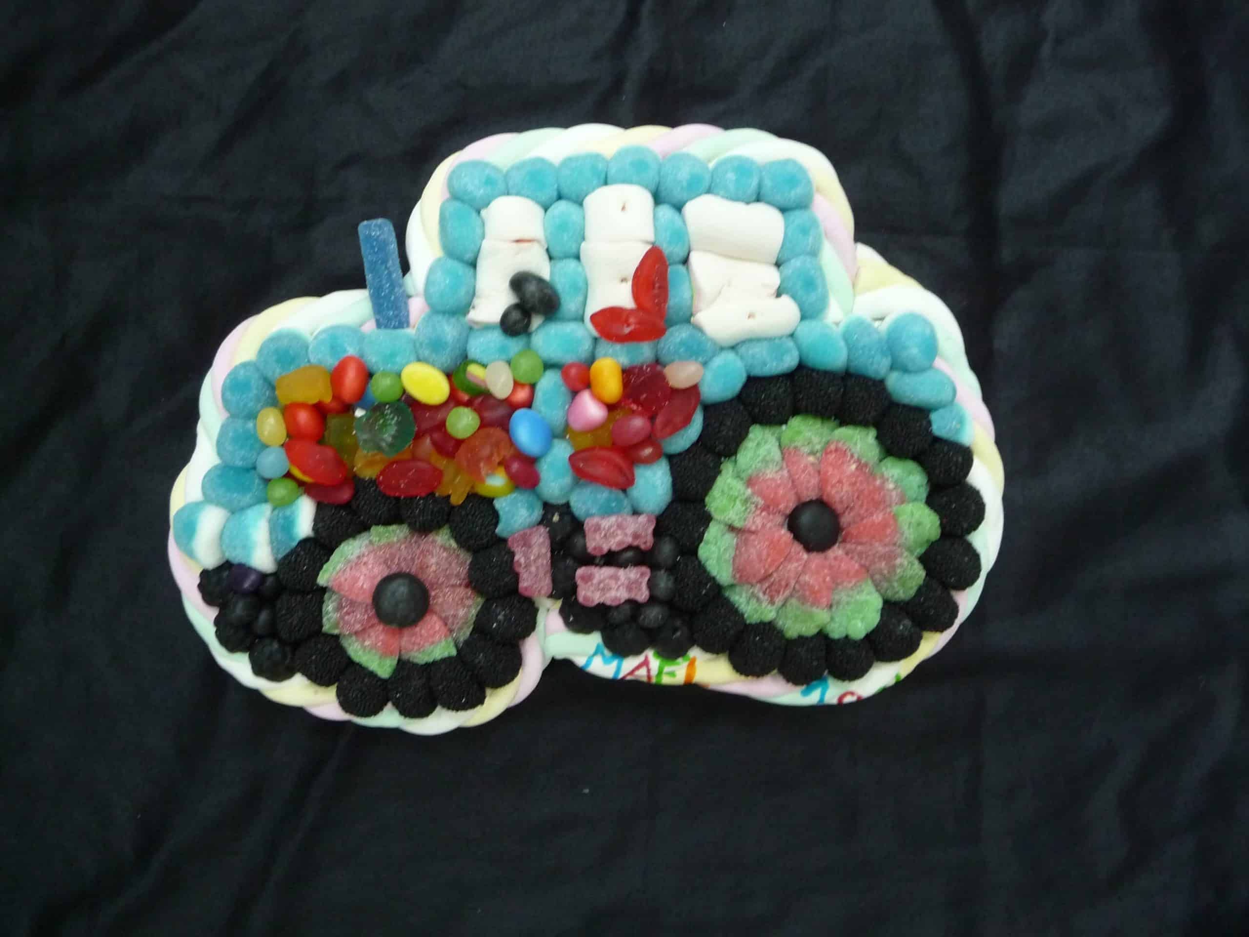 Gâteau de bonbons en forme de tracteur, contenant au minimum 600g de bonbons. Contour en marshmallow avec à l’intérieur des minis confiseries de 10 variétés différentes.