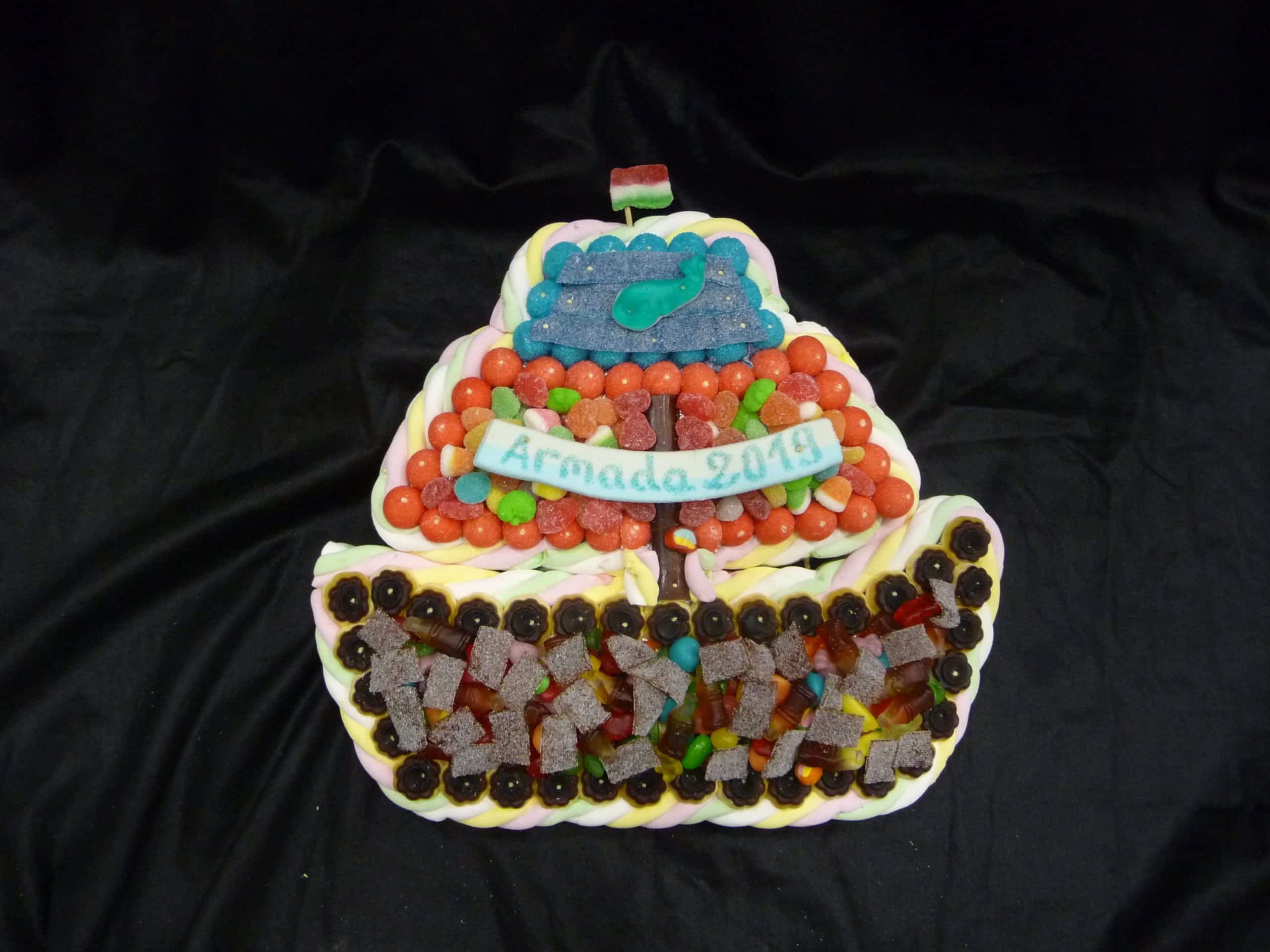Gâteau de bonbons en forme d’un voilier Armada. Le contour est en marshmallow. Intérieur garni d’un mélange de petites confiseries.