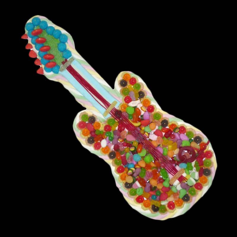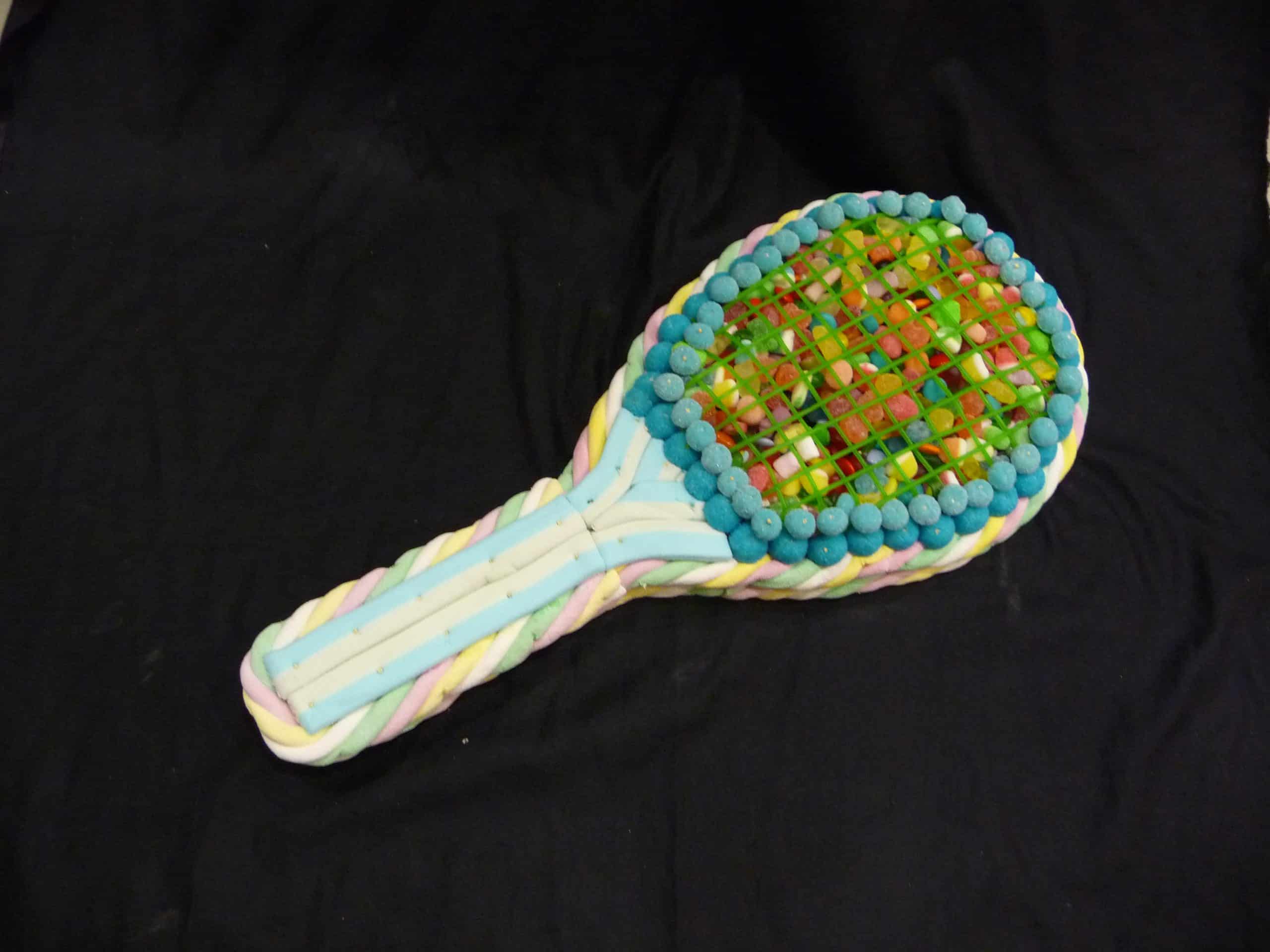 Gâteau de bonbons en forme de raquette de tennis. La raquette comporte 1,2 kg de bonbons minimum. Les cordes sont en fils de la marque Hitschler.